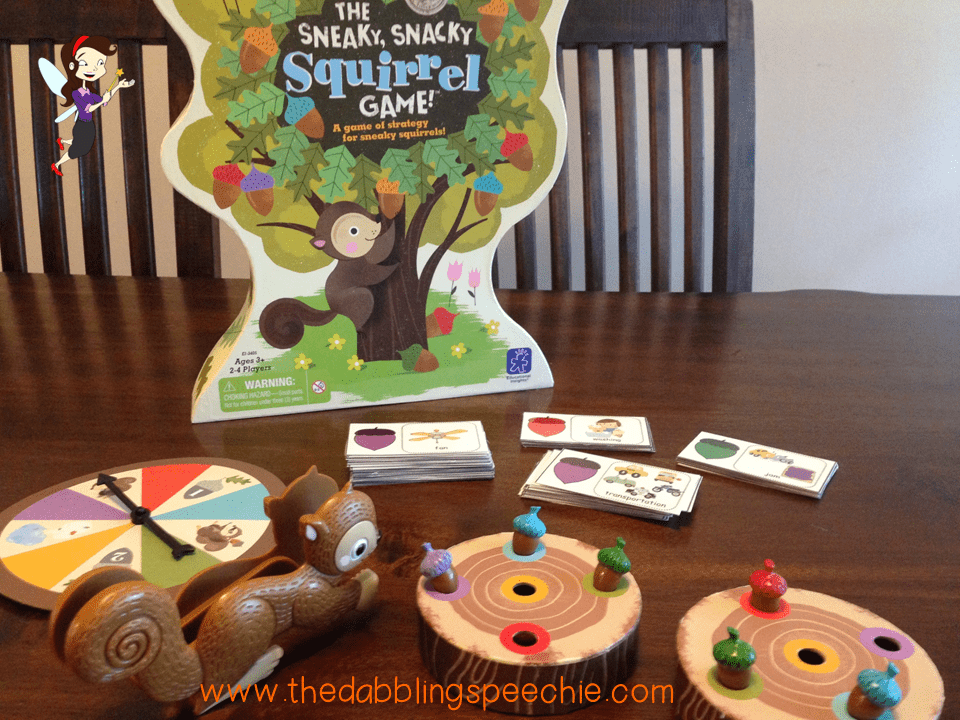 Today, I wanted to share how using Sneaky Snacky Squirrel in speech therapy can increase student engagement and still target language skills! Have you ever played Sneaky Snacky Squirrel game with your little speechies? It is a really fun game that is perfect for the fall season. I usually utilize this game as a reinforcer for articulation and phonological process kids, but needed something to use for language goals. You can grab this game on amazon and if you have PRIME, then it is free shipping! (amazon affiliate links provided)