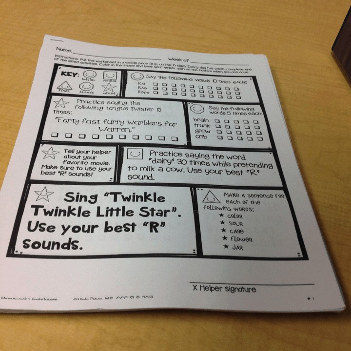 - Miss V’s Speech World has an incredible 52 Weekly /r/ homework worksheets product that helps you get sound-loaded R practice in your session and a one-page R worksheet to send home for weekly practice.