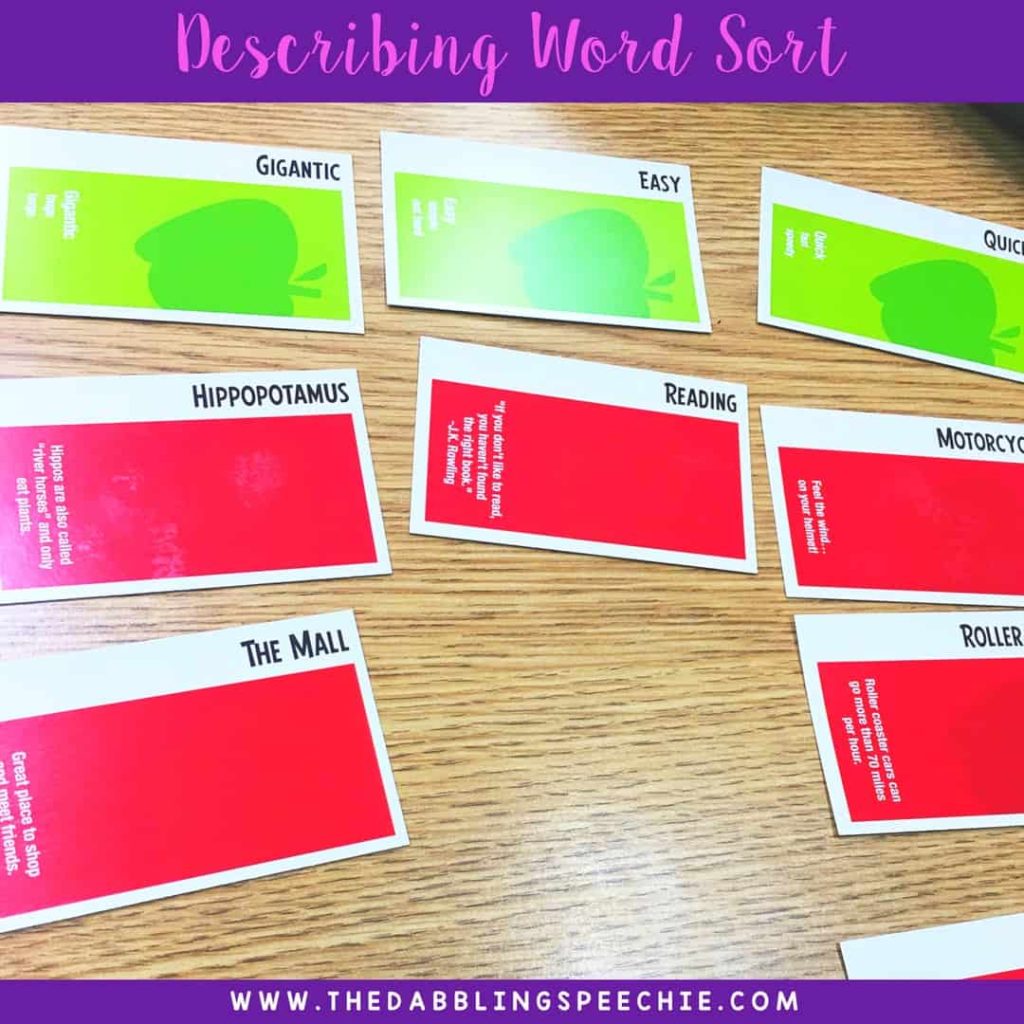 Have students sort the red cards into the different “describing” word piles. This helps work on a critical attribute feature and antonyms.