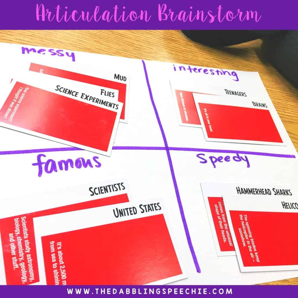 Your articulation students can brainstorm things that are messy, interesting, famous and speedy either by placing the red cards in piles or just simply writing a list! I had my /s/ friends make sentences after they brainstormed. For example, “A room is messy. Flies are messy. A scientist is messy.”