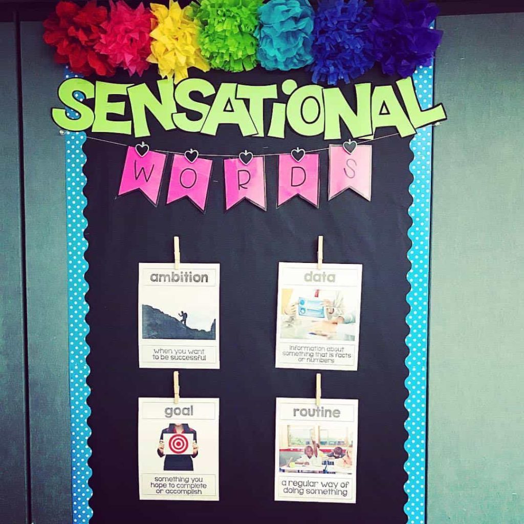 Crazy speech world made a bulletin board that has themed tier 2 vocabulary words, so you can have targeted vocabulary words on display every week. I love using themes in my therapy plans, so this is a great way to visually showcase a set of new words for students to review.