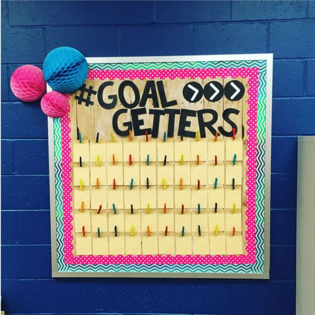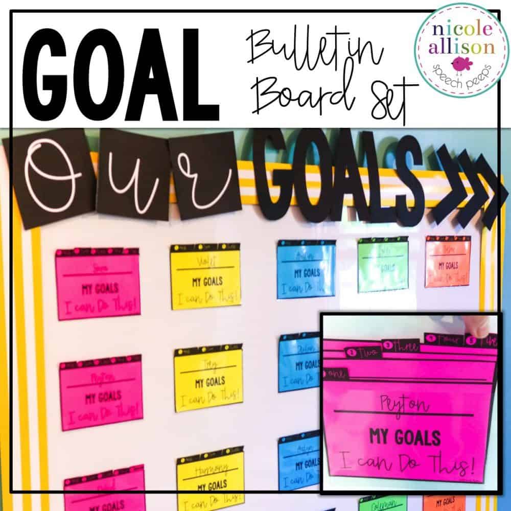 Here is another goal bulletin board from Speech Me Maybe! She took envelopes and attached them to the board with clothespins that have a push pin glued on the back. Students can get their goal cards out to review before starting therapy!