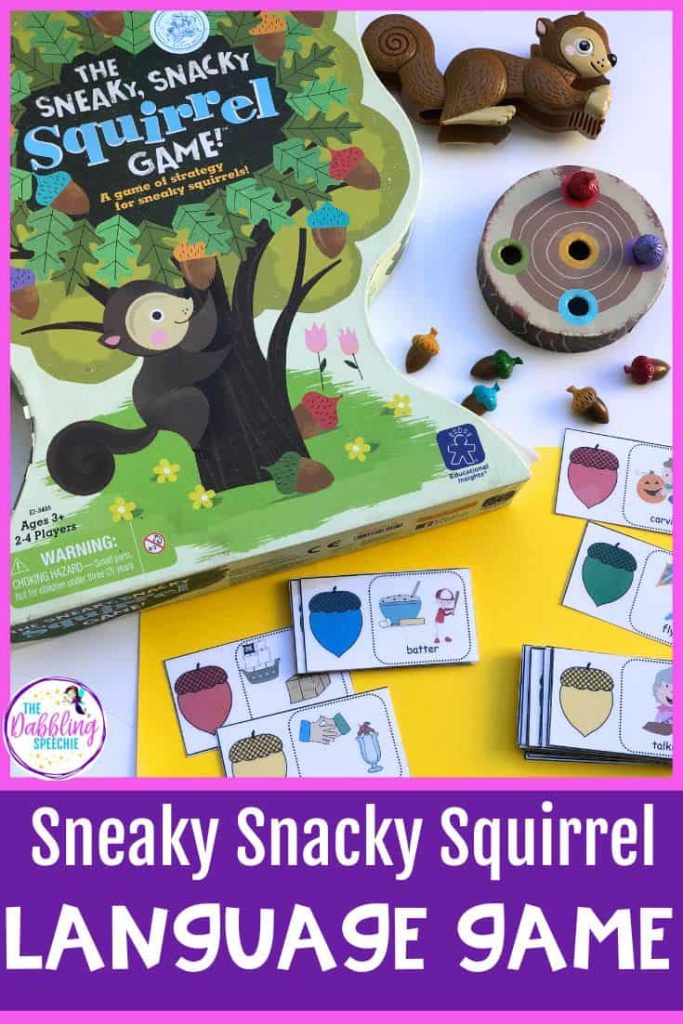 We have been playing the Educational Insights The Sneaky, Snacky Squirrel Game (amazon affiliate link) in therapy with my I’m a Nut Language cards. It has made therapy so easy to plan because I can grab n’ go! We worked on using verbs in sentences, describing by attributes, multiple meaning words, and categories!