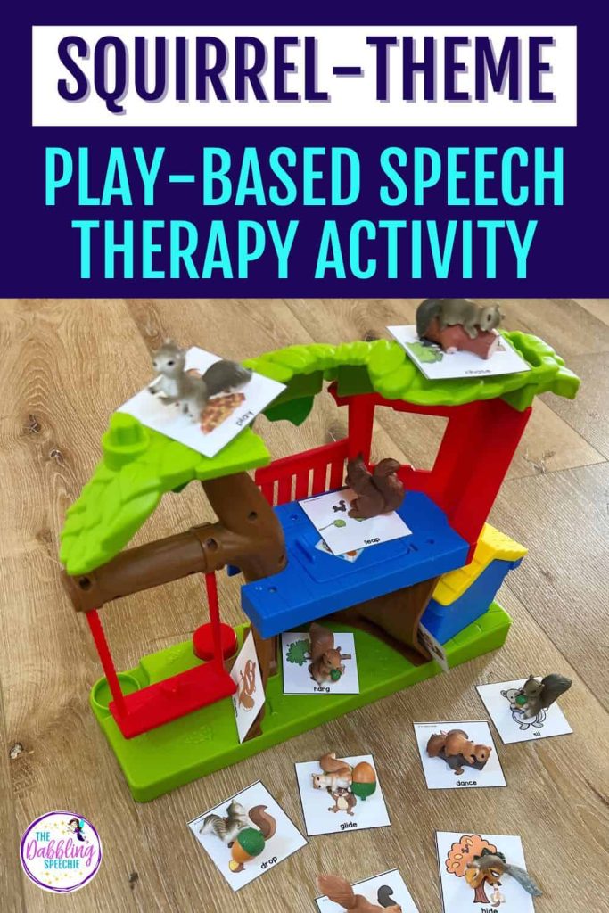 For your play-based speech therapy sessions, you can use a treehouse toy set with squirrel figurines to work on verb actions, spatial concepts, wh-questions, and story retell.