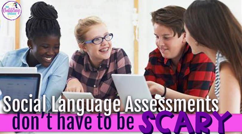 School based SLPs have to assess a LOT of different disorders across a large span of ages. During the course of my career, I have assessed students at the preschool level all the way to high school. Feeling confident with speech assessments in so many speech and language areas is overwhelming. Have you also noticed the increasing demands to add more assessments to your reports, so that they are legally defensible? That makes doing them extra scary. Because, one, I fear that I won’t have enough time. Secondly, I want to make sure I have covered all the areas of concern. Which takes more time. That I don’t always have. Today, I want to share about how SLPs can feel more confident when conducting social language assessments. I know they can feel scary, and time consuming. Knowing how to map out what you need can make doing them less intimidating.
