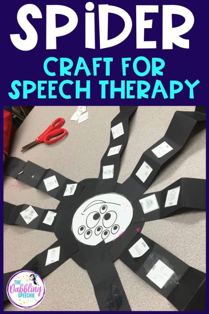 Make a crawly spider in speech. Students can practice following directions while making this spider craft. You just cut out black circles for the head, print the spider face printable (free printable), and then cut black strips of construction paper. The students fold the construction paper back and forth to make the legs. You can work on simple sequencing of how to make the craft and practice the basic concepts “on,” “before,” and “after” while doing the craft. After creating the craft, you can work on asking which pictures are near the spider’s head and far from the spider’s head.