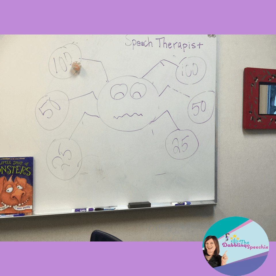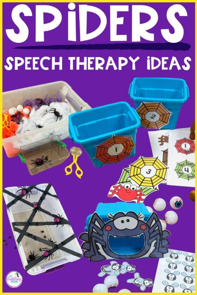 Other fun reinforcer activities are printing out a spider, cutting a hole for a mouth, and feeding it flies, eyeballs, and flashcards to keep students motivated. Similarly, you can tape spider webs to boxes and have students use ball poppers to try and hit the web targets. We provide printables in our toy guide in the Themed Therapy SLP membership spider unit so that you can use these games for any speech or language goal.