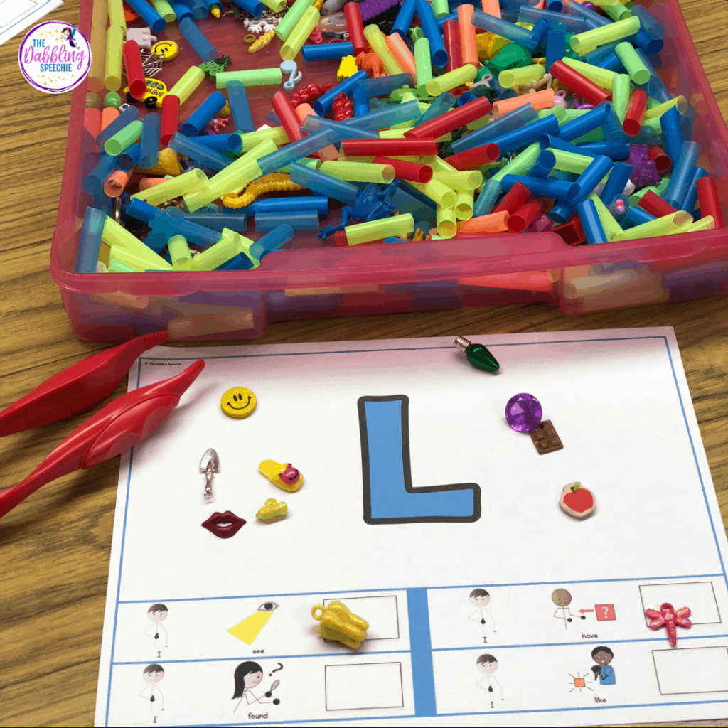 Make an “I Spy” sensory bin! There are a lot of different ways to use this sensory bin. One way is to make an articulation station activity. Seriously, this is probably my most used sensory bin and was the easiest to make once my dinky doodad order arrived!