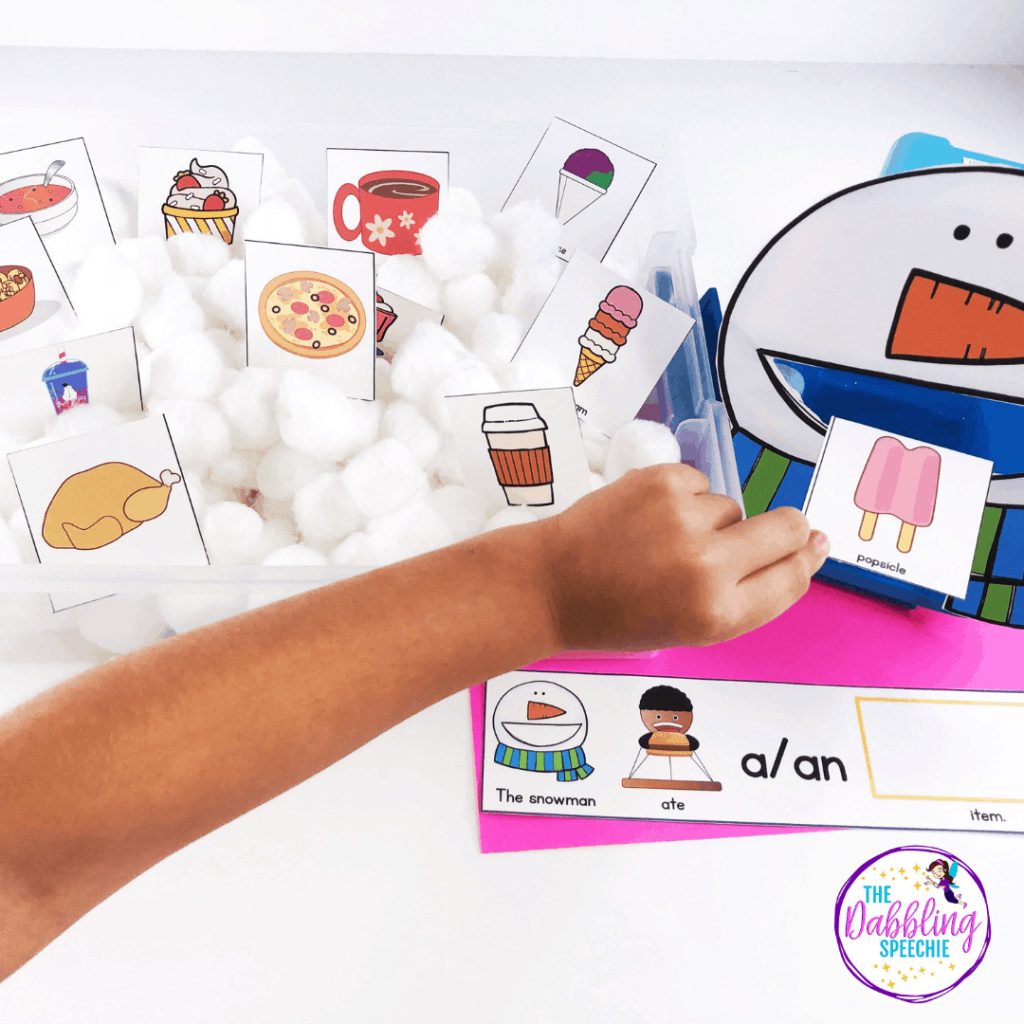 Students love when you can feed cards into a character! I made this feed the snowman sensory bin to work on learning about hot/cold food items. I also included other food items to work on different food categories. You can simultaneously work on past tense verbs and building MLU. This sensory bin is in my Snowman PUSH-IN Language Lesson Plan Guide.