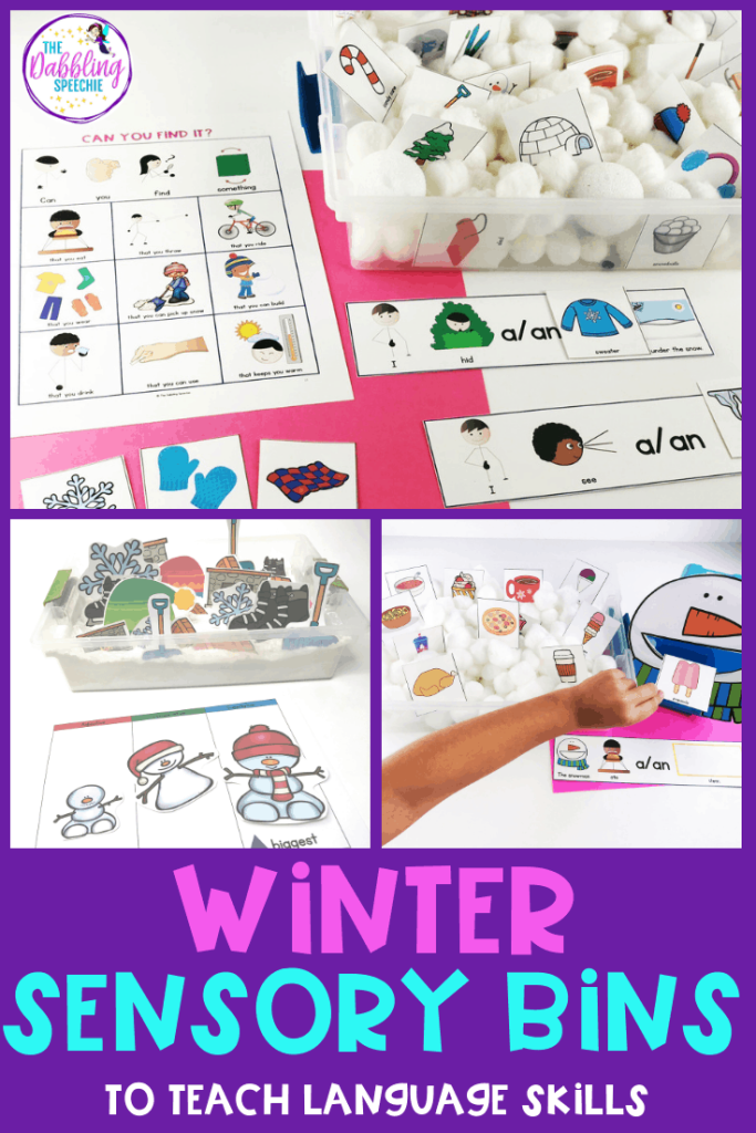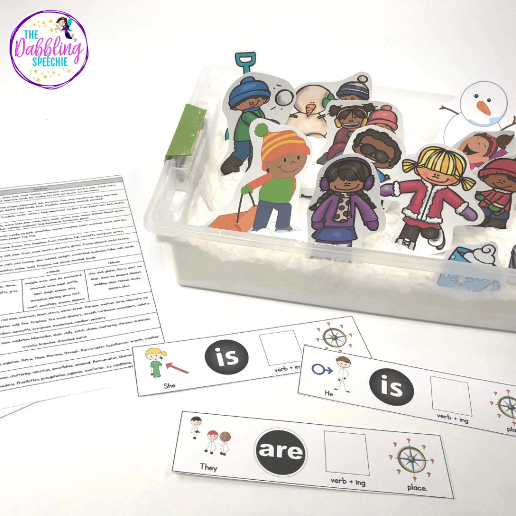 Because many students with language impairments need to work on syntax and vocabulary, making a bin to work on winter verbs or nouns can be an engaging way to work on describing and sentence structures.