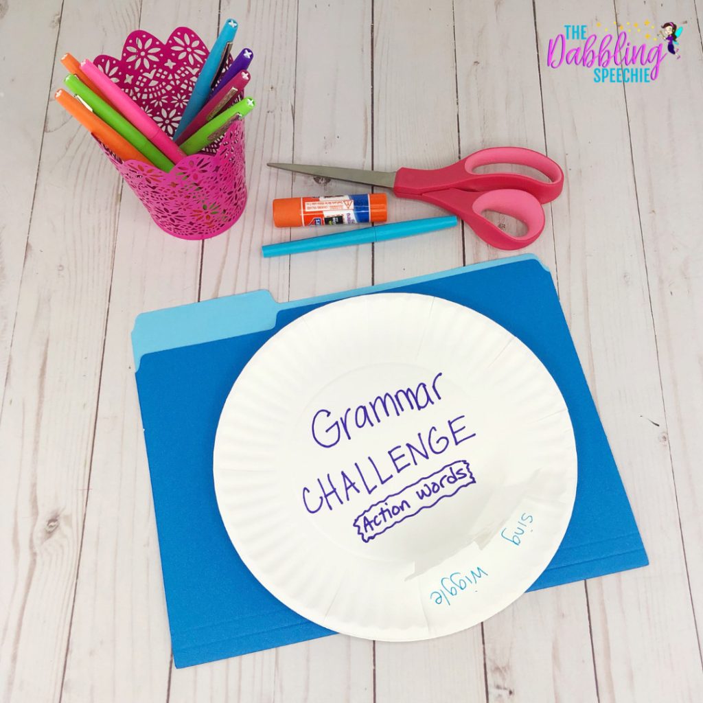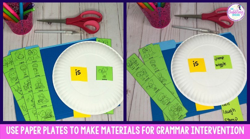 So, for example, you can make a paper plate grammar slider to work on noun-verb agreement and present progressive markers.