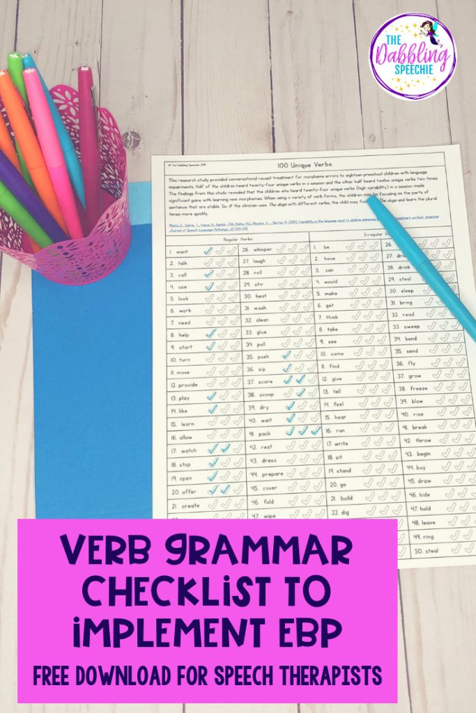 Students can flip the flaps as they practice using their grammar target at the word or sentence level. After doing some drills, you can have students do “verb charades” and act out different verbs as an engaging activity. If you need help with coming up with verbs, download my free verb checklist by clicking the button below.