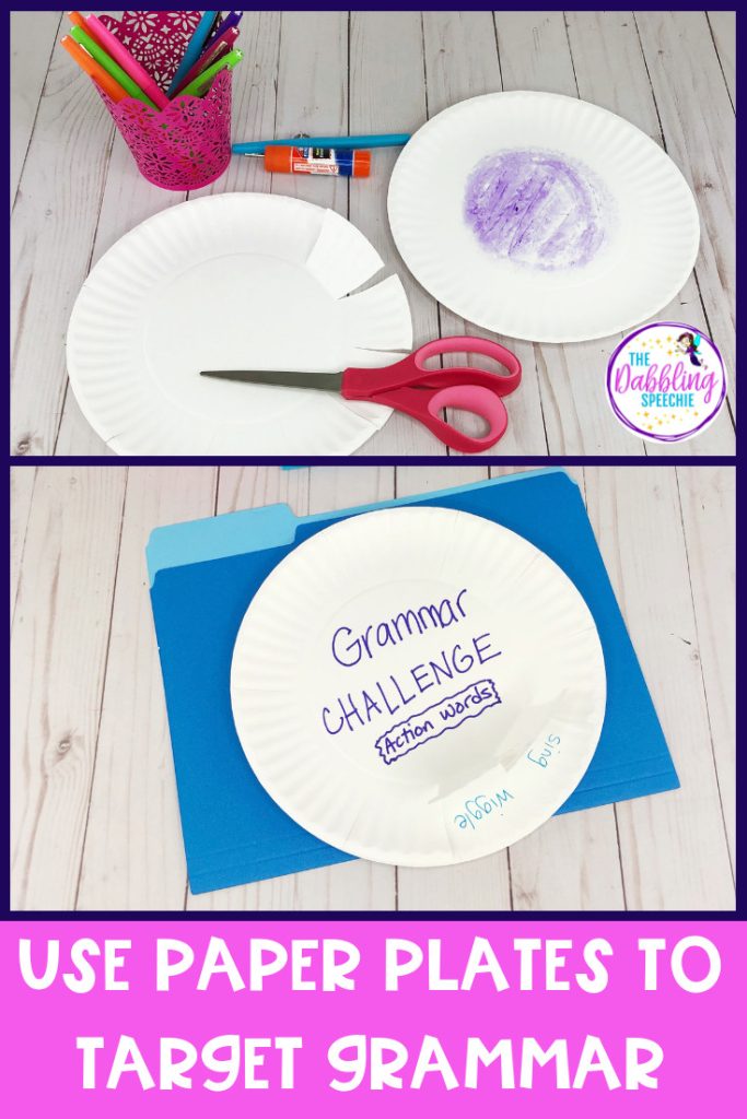 What materials, books, or resources do you use to work on grammar in speech therapy? Share in the comments. If you make these fun paper plates in therapy, I would love to see pics. Just tag me on Instagram @thedabblingspeechie.