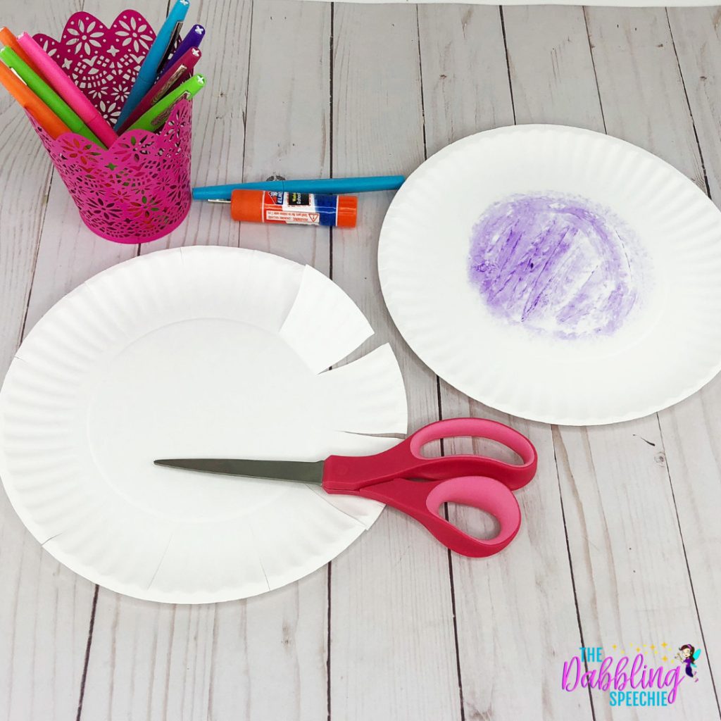You can also work on grammar targets with a fun grammar challenge using paper plates. You need two paper plates. With your scissors, cut 2-inch slits around the plate. Then, on the other plate, put a generous amount of glue on the middle of the plate. Then, stick the plate with the slits on top of the glue.