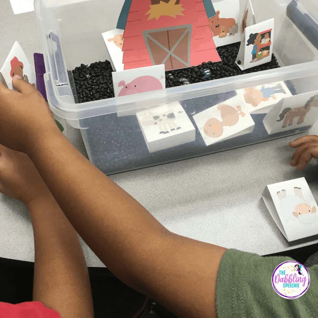 Use the Create-A-Scene for the farm (Amazon affiliate link) to work on simple story telling, practice verb +ing, following directions, describing nouns by attributes and answering wh-questions.