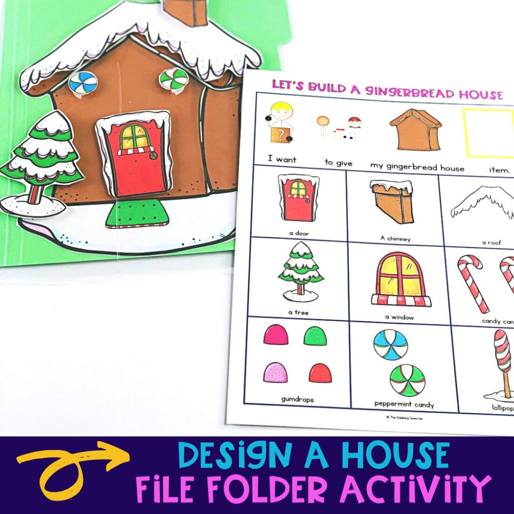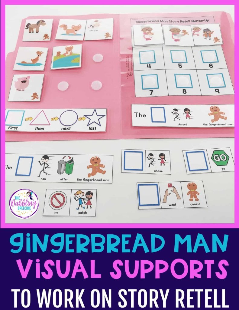 To work on story retell using The Gingerbread Man, use file folder activities to help scaffold oral narration.