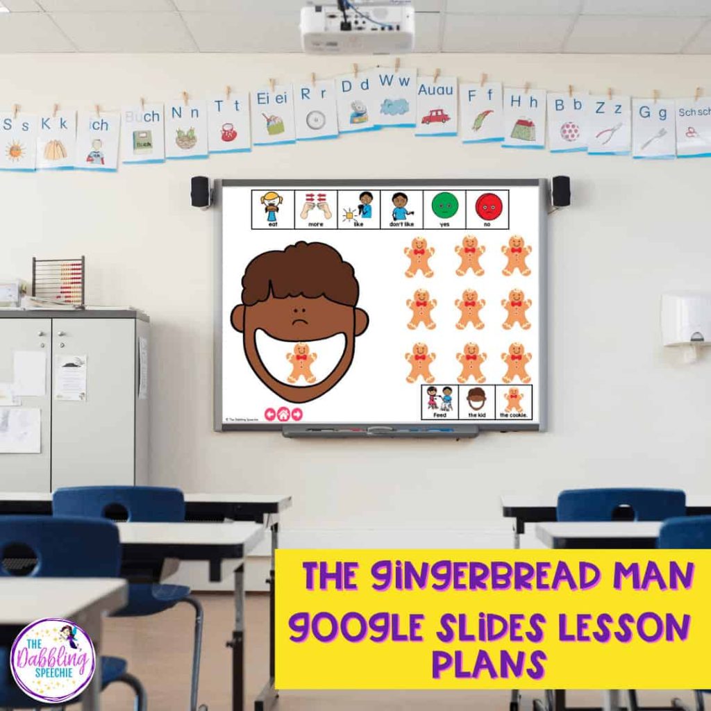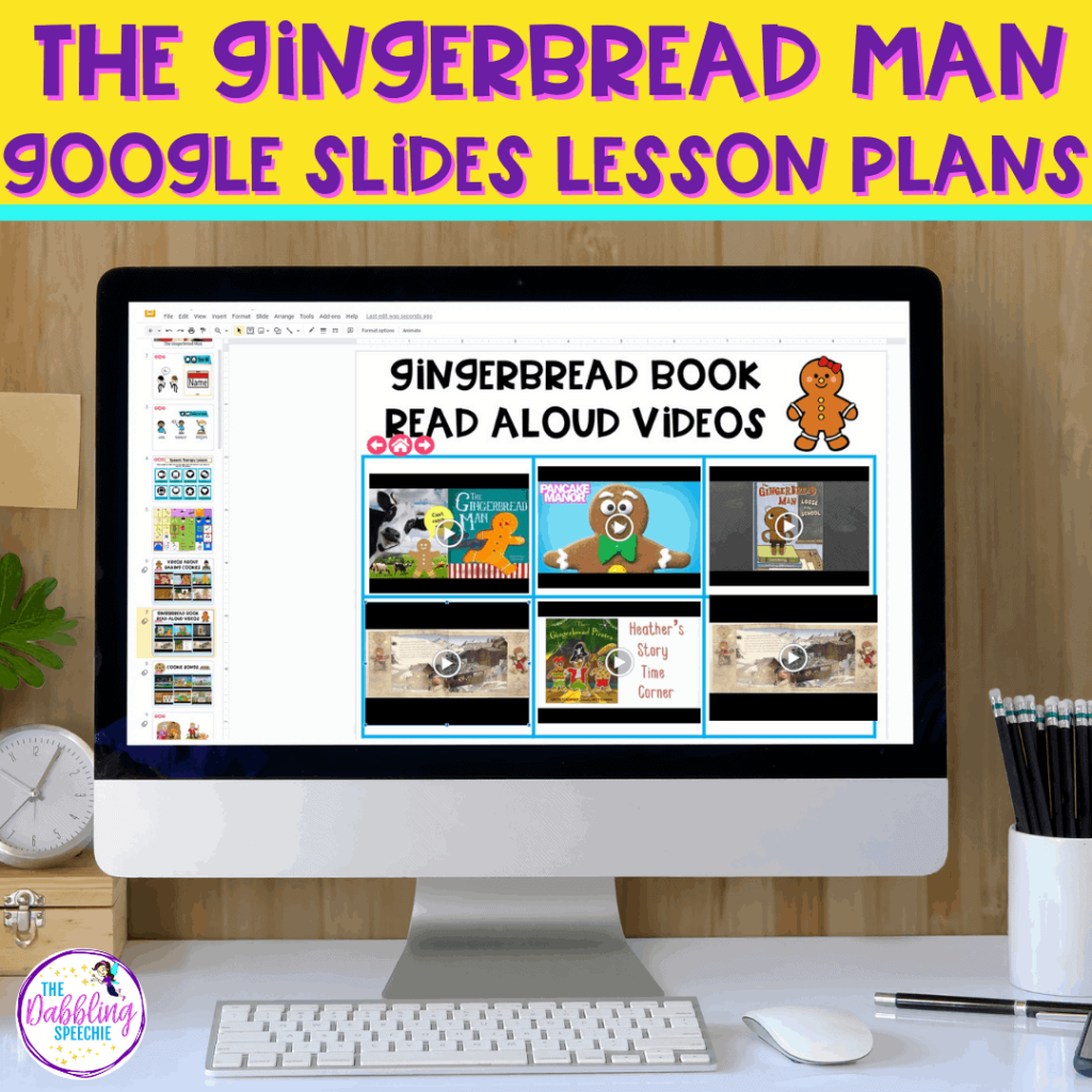If you are doing teletherapy, you can use this Gingerbread Man Google Slides™ included in the Gingerbread Man Push-In Language Lesson Plan guides to have all your book read alouds, brain breaks, videos, and digital materials organized so you can easily get to the activity you want to use. You can link to websites and other materials on the Google Slide as well. I will often add Boom Card links, YouTube videos, or websites that have fun gingerbread man games like ABCya.