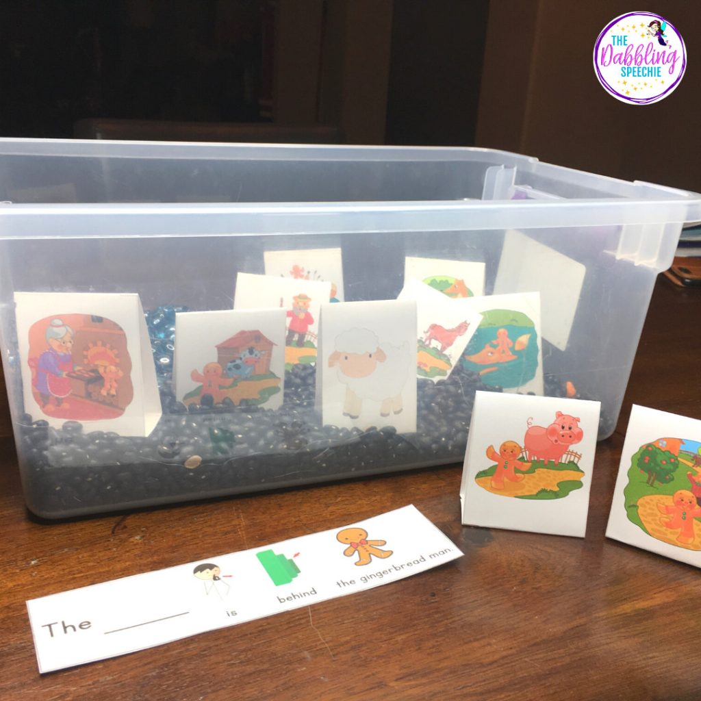 Work on story retelling using visual supports in a gingerbread man speech therapy sensory bin with these free printables! Not only can you work on The Gingerbread Man story retelling, but you can also cover comprehension, verb tense, vocabulary and more!