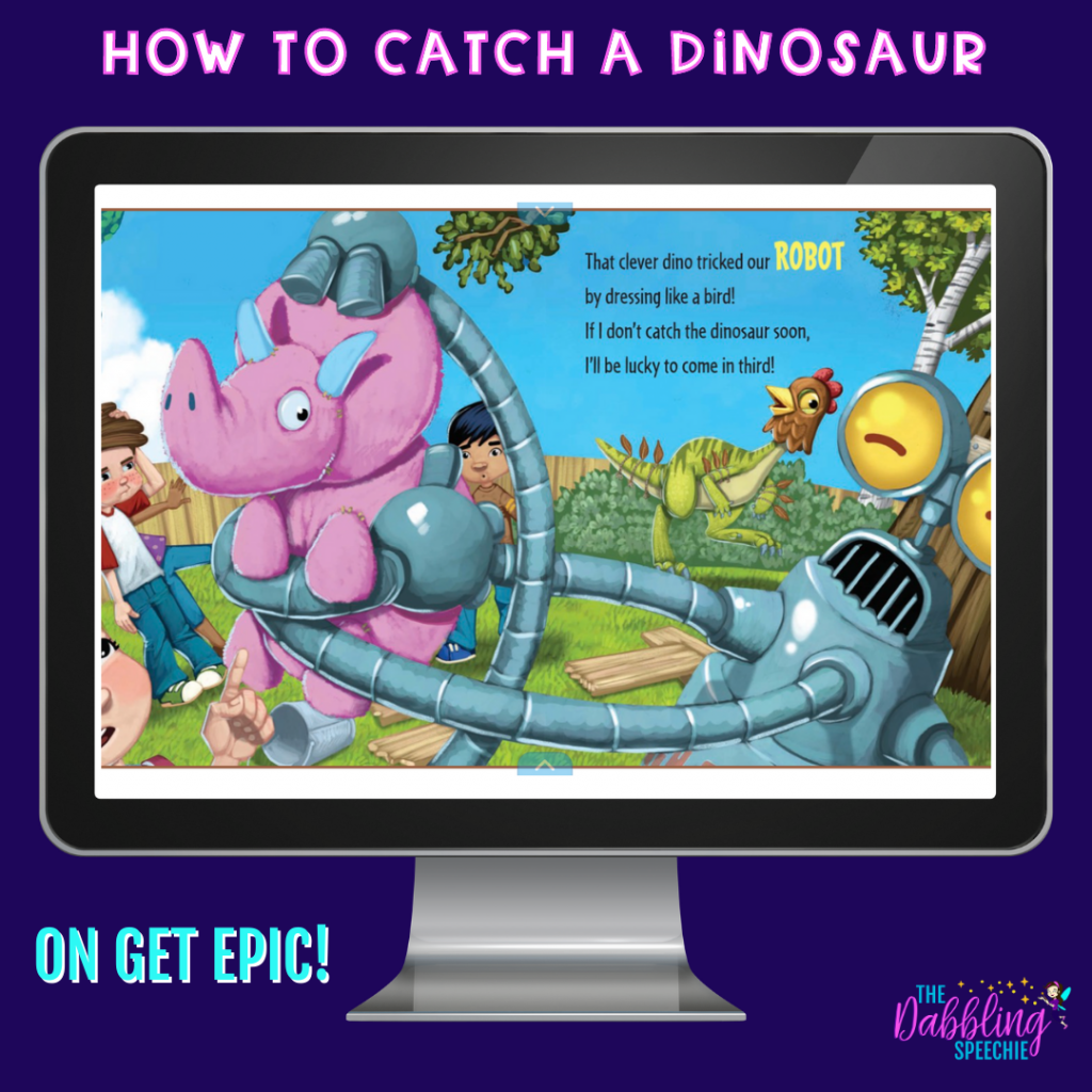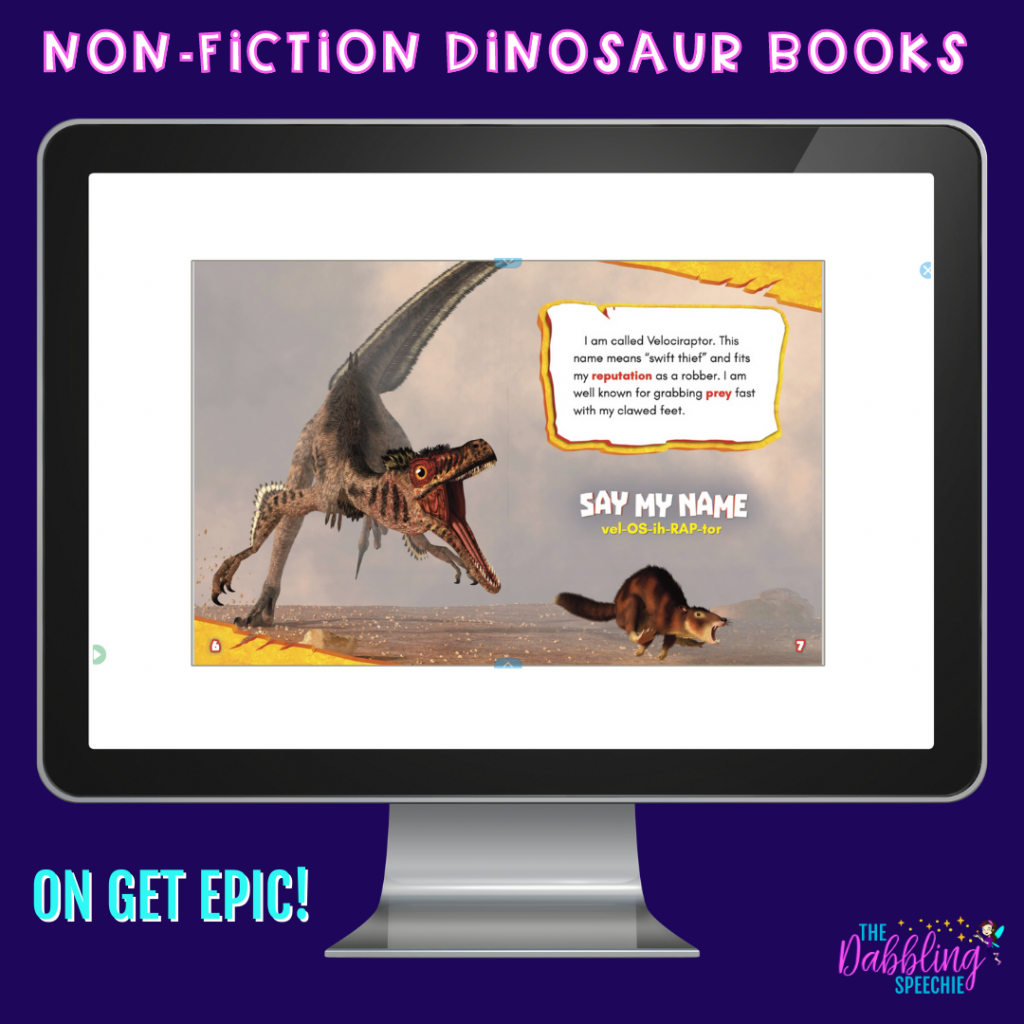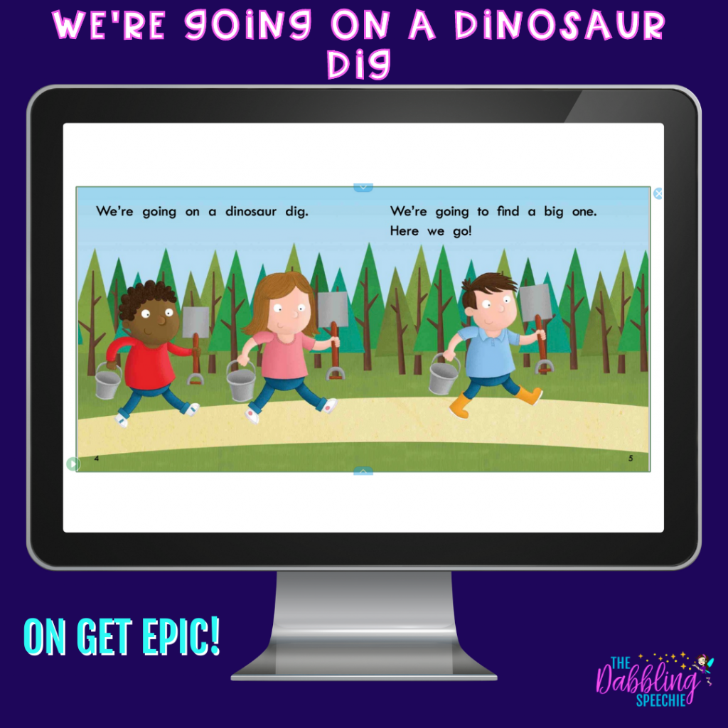 If you are needing books with a dinosaur theme to use in teletherapy or in-person, check out Get Epic. They have a great selection of digital dinosaur books that you can use for a variety of ages.
