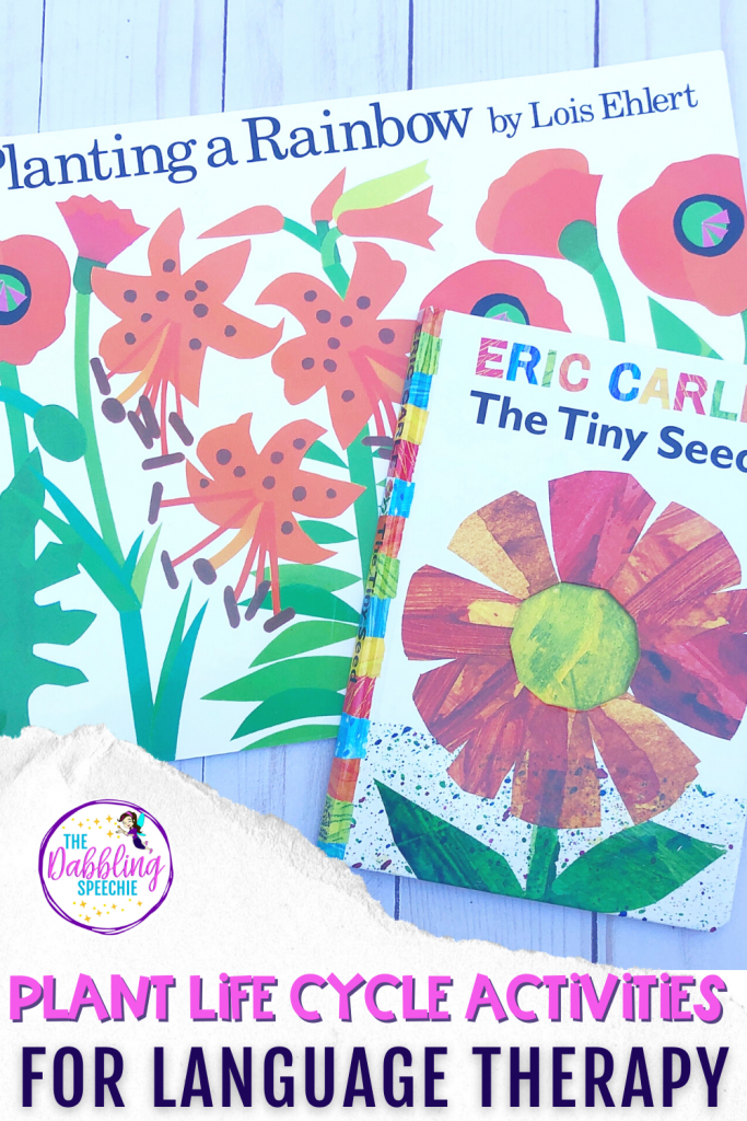 Another great way to discuss the plant life cycle is through books. This can be a great resource to help work on wh-questions, describing, and building vocabulary in the context of the book. Here are some book recommendations that would help you teach the plant life cycle (Amazon Affiliate links include):