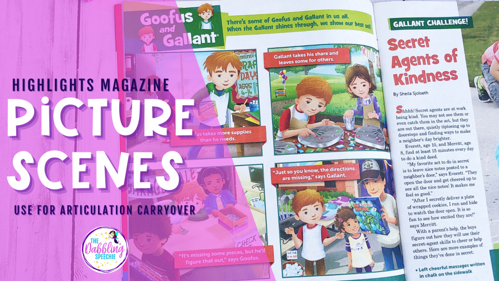 As a kid, I LOVED the Highlights magazine. Did you know that there are hidden picture scenes and other short stories with picture scenes that you can use to work on articulation carryover?