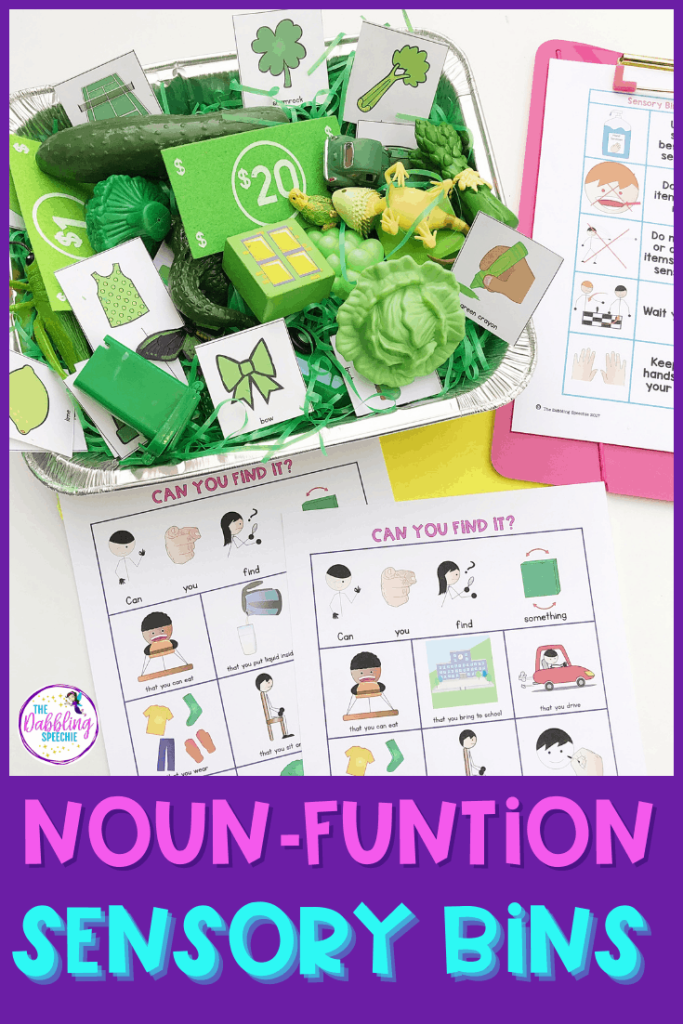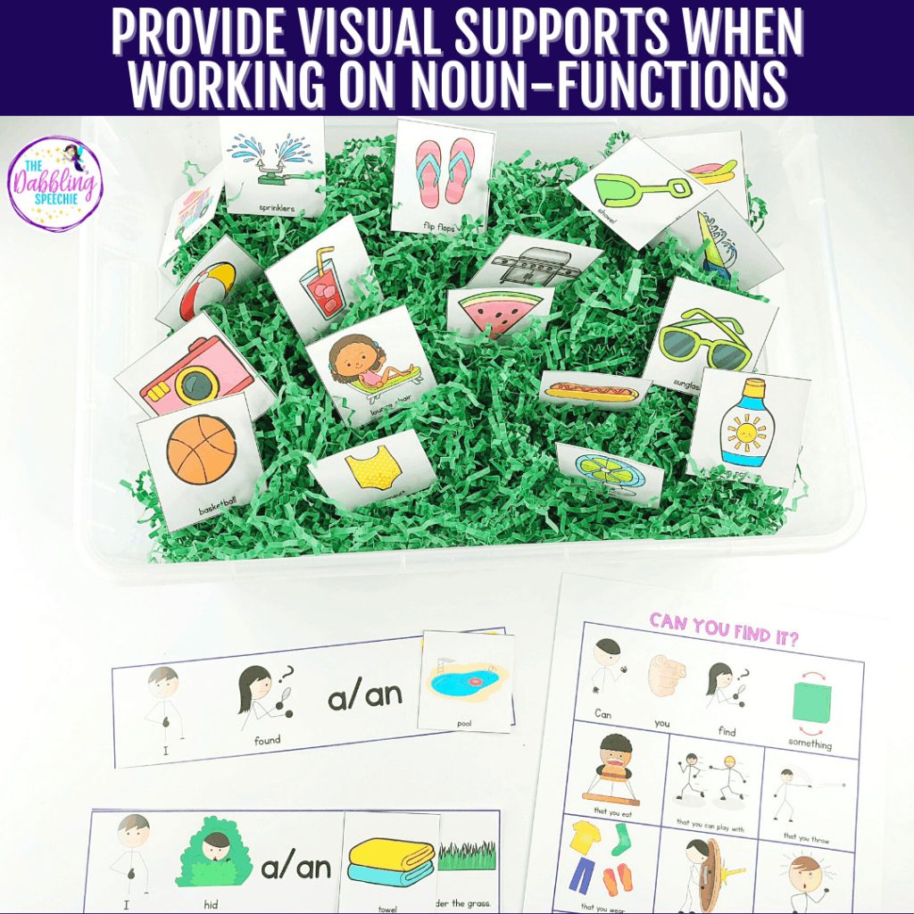 Targeting noun-function is a great way to develop language skills. I like to use noun-function activities with my preschool and kindergarten students who need to build their functional vocabulary. Filling a sensory bin with your target vocabulary is a fun and engaging way to practice this skill with your students. Today, I am going to show you how to make a “Can you find it?” noun-function sensory bin to use in language therapy.