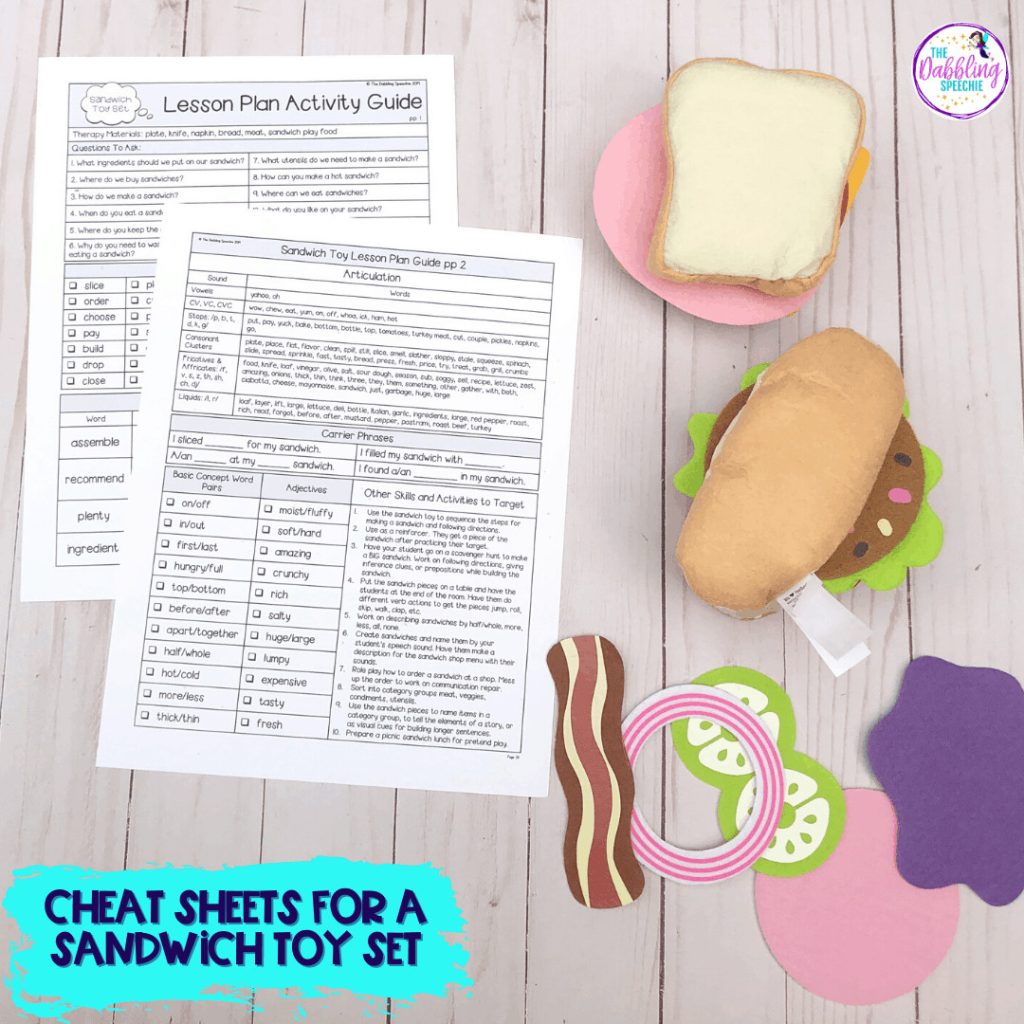When I first began incorporating play based activities into my therapy, I felt very overwhelmed. I quickly began to run out of ideas on how to incorporate my students’ goals in play without being repetitive or burnt out. I have found that when I have cheat sheets handy in my sessions, I spend less time thinking of targets and more time meaningfully interacting with my students. If you want to save more brain energy AND feel prepared for play therapy without hours of planning, then grab these toy companion cheat sheets for speech and language therapy. Included are cheat sheet guides for over 25 toys!