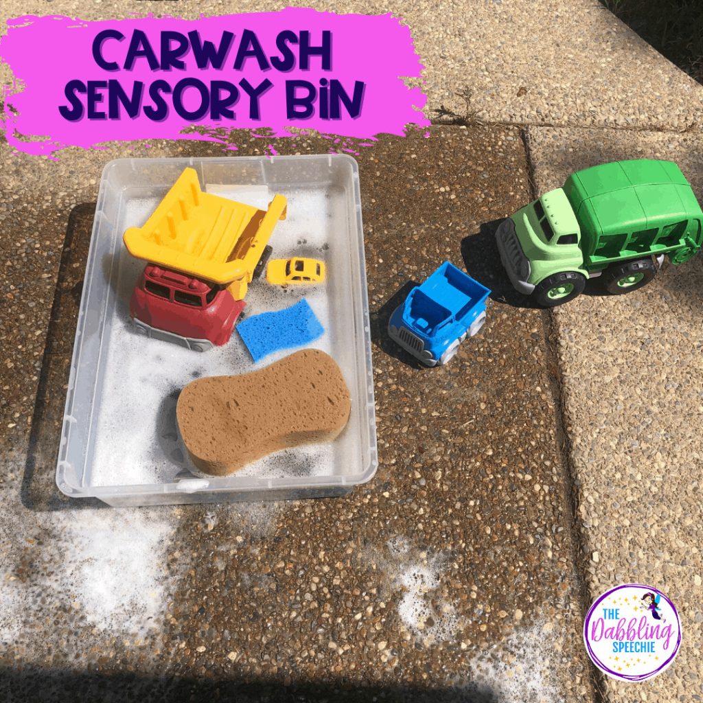 Use a garden or car wash theme to make sensory bins to target your students goals. Fill a bin with water, soap, and cars or trucks of different sizes and colors. List the attributes or the cars and work on basic concepts as the cars and trucks go in and out of the car wash.