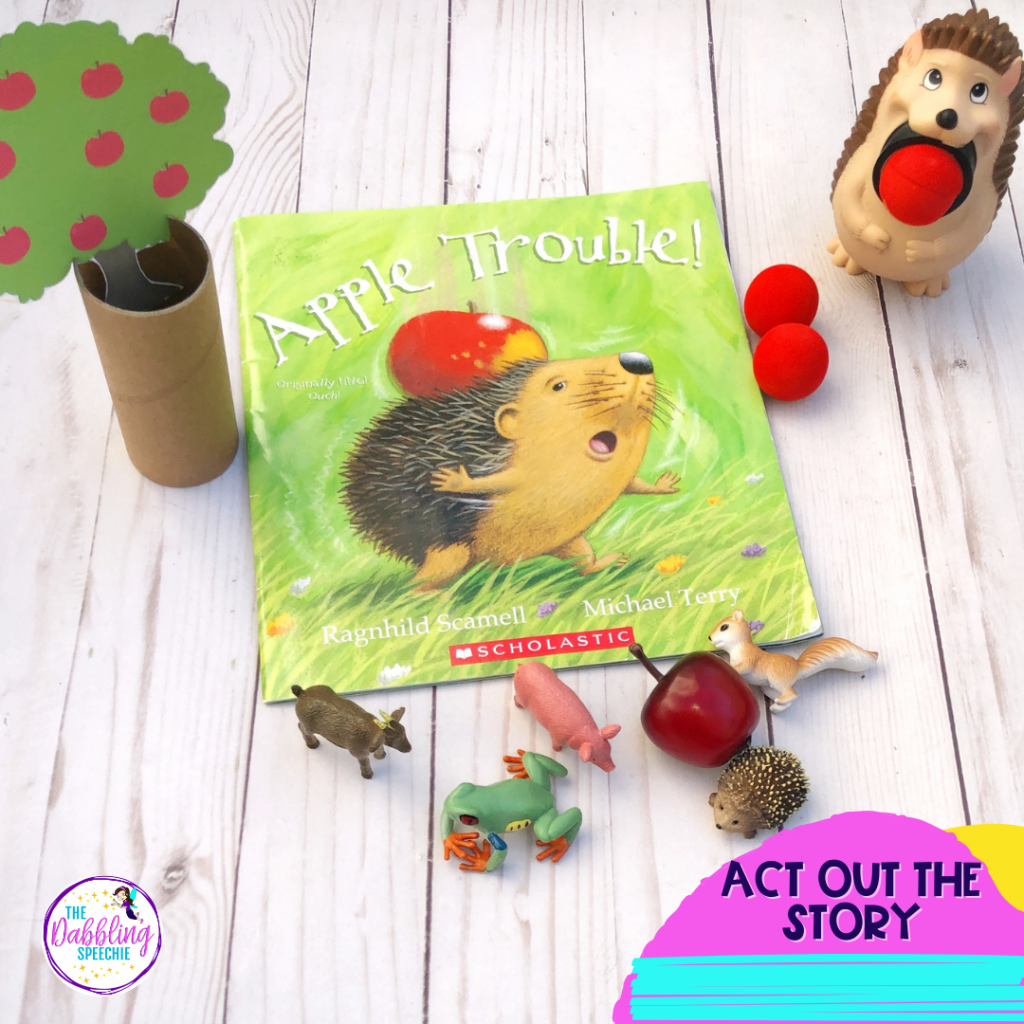 If you are looking for a great fall book that works on story comprehension and story retell, you will want to check out Apple Trouble by Ragnhild Scamell. It was originally called Ouch!, so you may be able to find it at your local library under that name. Amazon affiliate links are included in this blog post for your convenience.
