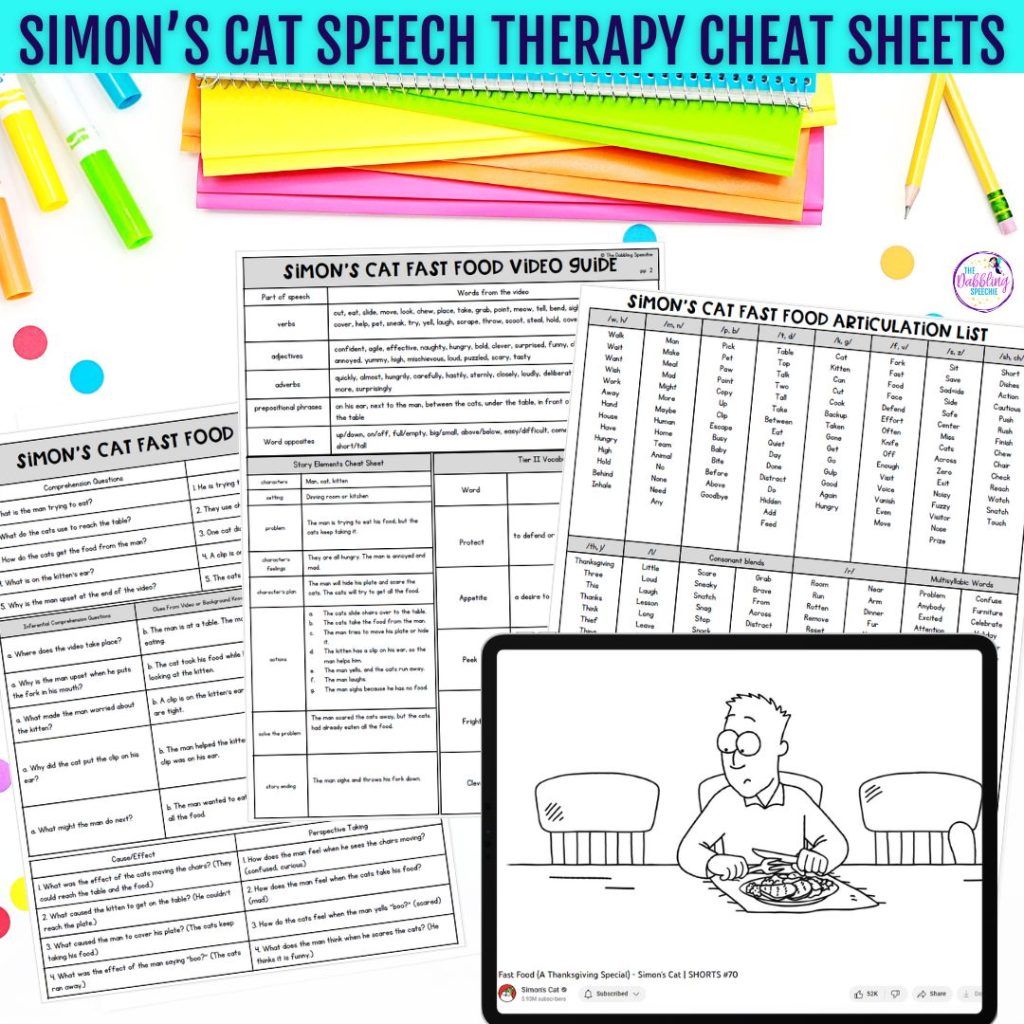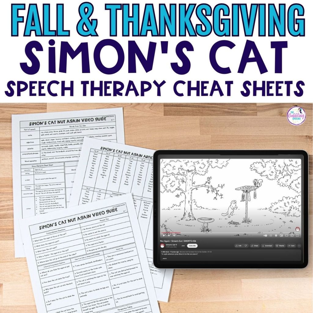 Simon’s Cat videos are the best for covering a LOT of goals. Here are two festive videos about Thanksgiving dinner. In “Fast Food,” Simon enjoys his turkey dinner while his cat sneakily grabs his dinner when he isn’t looking. In the other Thanksgiving video, the cat is trying to prepare to eat the bird for his dinner. Not only are these wordless short videos great for inferencing and cause and effect, but you can also use them for articulation, vocabulary, grammar, and story-retelling goals. I make it easier for you by creating 3-page cheat sheets with pre-selected targets so you can easily pullout with a mixed group.