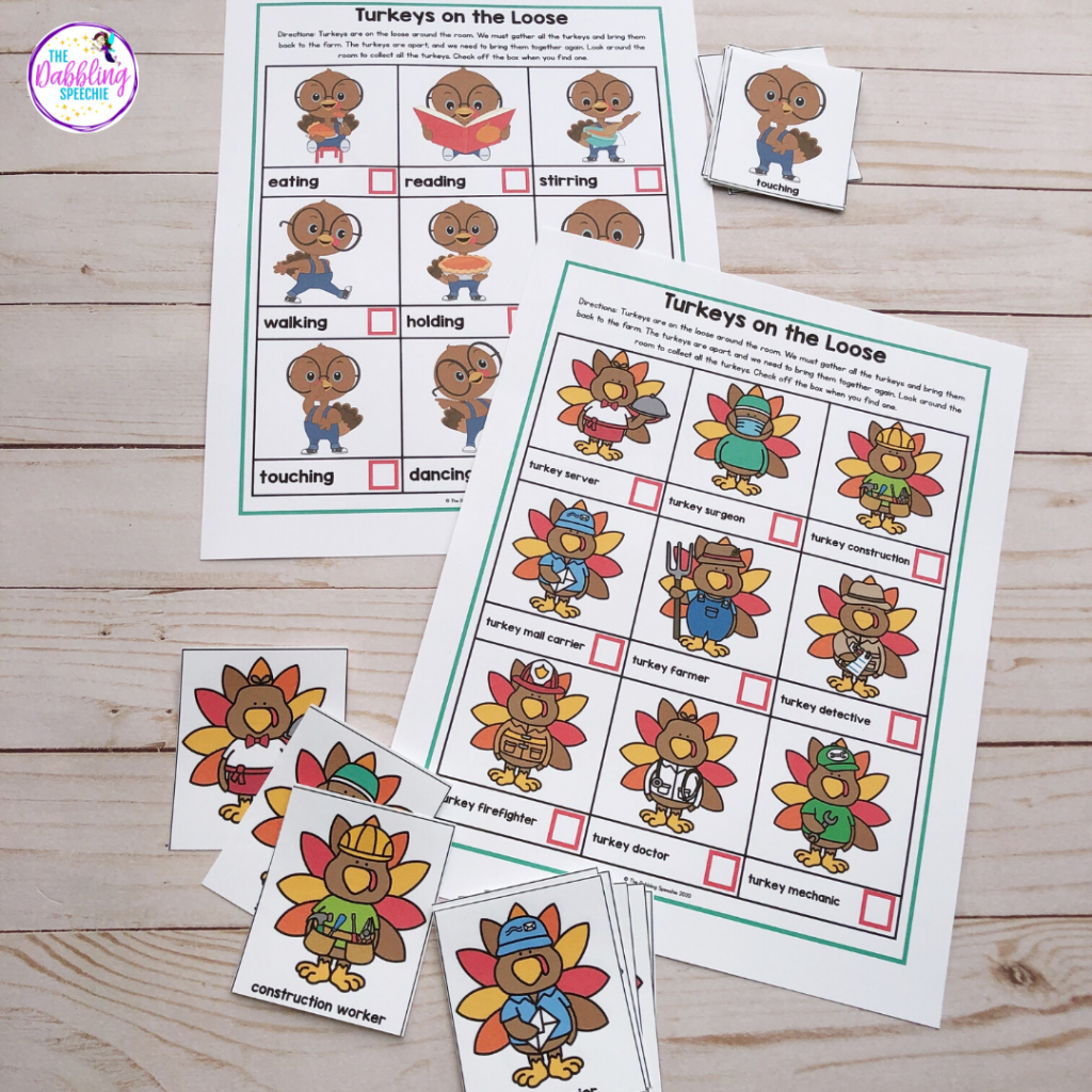 I recently found this FUN turkey video that show silly things happening with turkeys. Make sure to preview the clips to make sure there isn’t anything inappropriate like cussing. You can use the video clips to create grammatically correct sentences, identifying emotions, name verb actions, answer wh-questions, and allow students to see a real turkey to help them with learning descriptive vocabulary.