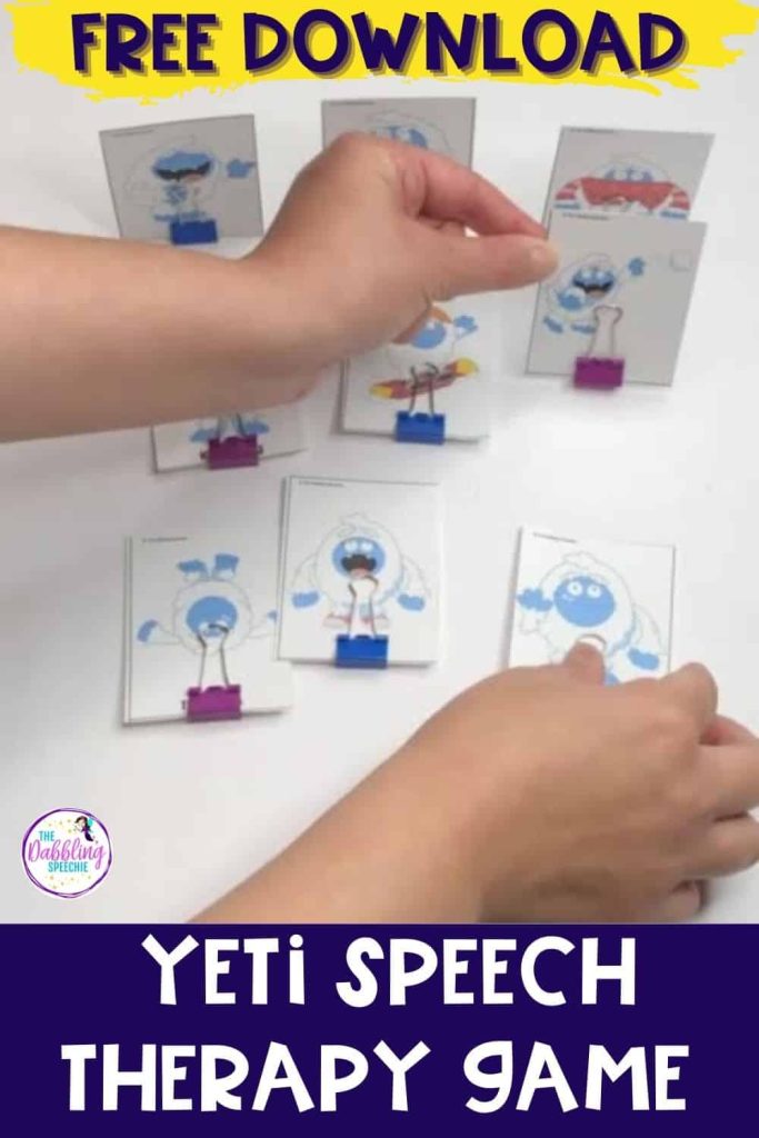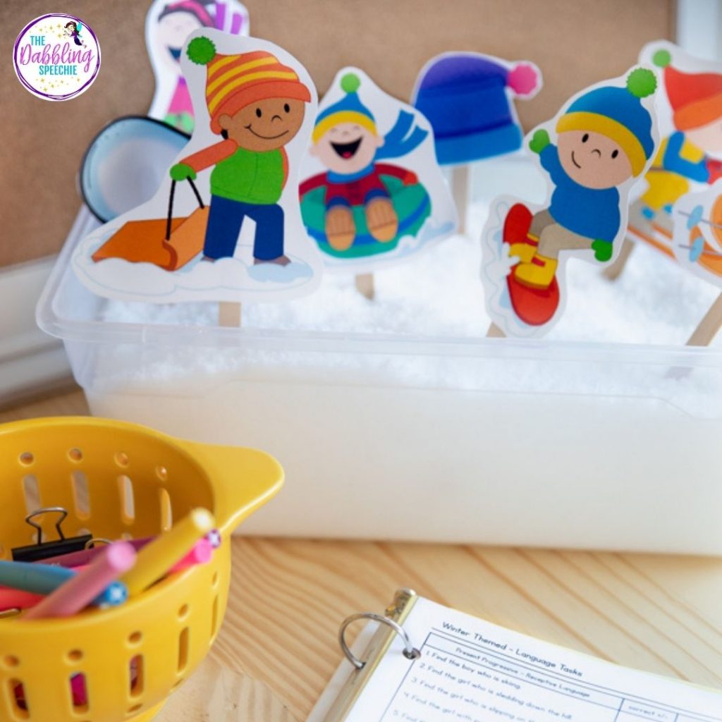 If you have other speech therapy printables, add them to the binder clips and have a snowball fight the last five minutes of the session. With your students working on speech sound disorder goals, put their target word flashcards on binder clips and knock them down. Whatever card falls, that’s the one they need to practice. See the winter sensory bin companion for some winter-themed printables to do this in your therapy sessions.