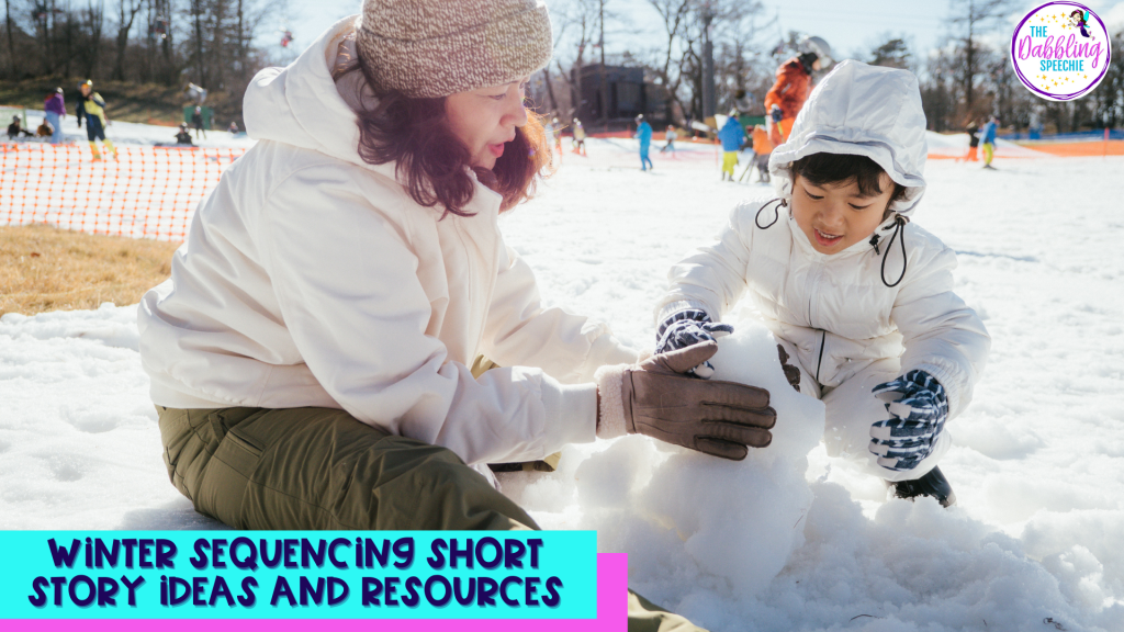 When it comes to planning with a themed-based approach it can be time-consuming to find enough activities to cover all the language goals. That’s why using sequencing short stories can help you cover comprehension, grammar, vocabulary, inferencing, and narrative skills in one material. Today, I will be sharing some different winter sequencing short story activities you can use to cover your caseload. Hopefully, these ideas will help you increase exposure to winter-themed vocabulary and hit a lot of other language goals!