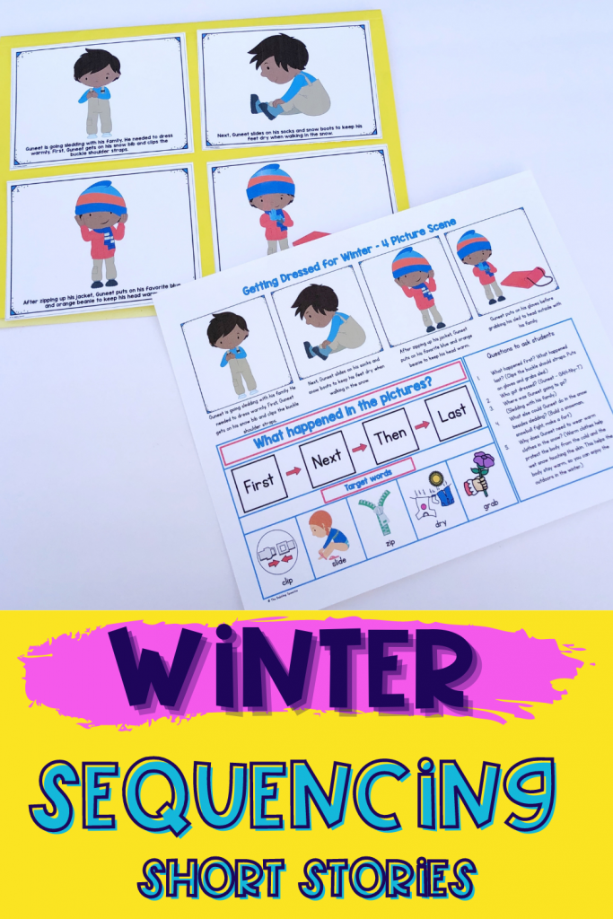Once you pick your sequencing task, you can create a short story to go along with it. For example, you can create a short story using a YouTube video of children dressing for snow or use the winter sequencing short story set in my store.