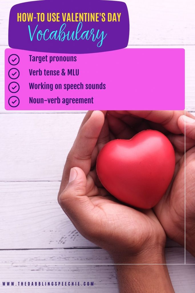 When it comes to serving our students with language goals, we want themed materials that can cover a lot of different language goals. Did you know that it takes children with language impairments up to 36 engagements with a word before they master it? That’s why it is super important for the word targets you chose. When you use a Valentine’s Day theme, you want to choose words related to the theme. Those words are more likely to appear in the Valentine’s Day books you read and the words being discussed in the classroom in February.