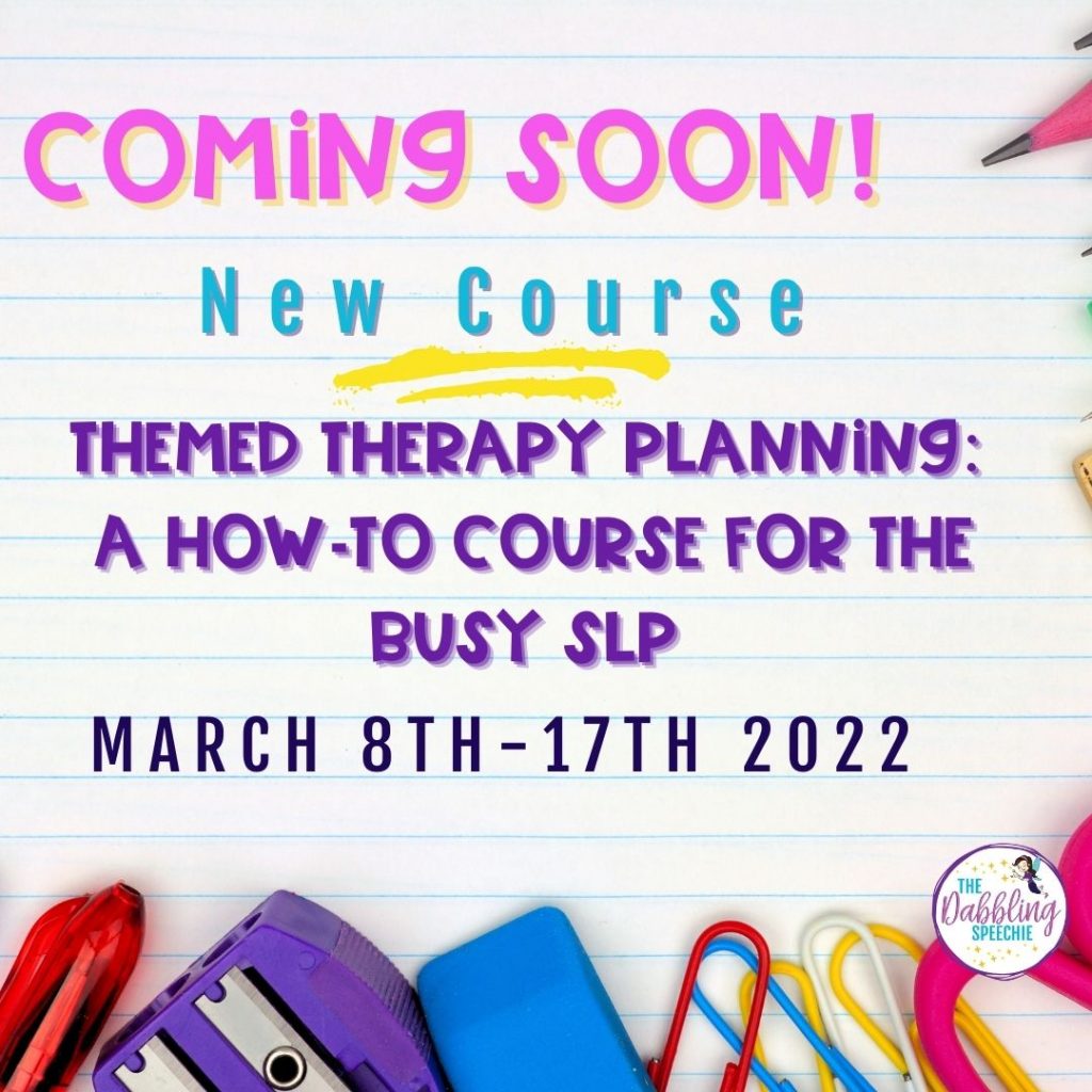 If figuring out how to plan themed therapy sessions is like trying out a new Pinterest recipe for the first time, I have good news for you! A Themed Therapy Planning How-To Course for the Busy SLP is coming on March 8th. You can earn clinical maintenance hours for your ASHA and state license while also becoming a rockstar at efficiently planning themed therapy for your Prek-5th grade caseload. Sign up for the waitlist HERE.