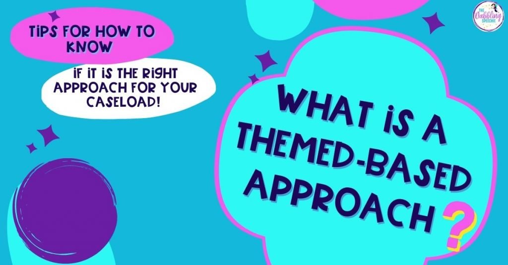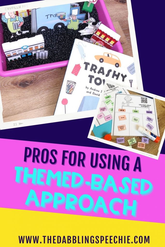 When you use a worksheet or activity that has cute, themed graphics but has random speech or language targets on the clipart, this is a skill-based therapy approach. The targets are not necessarily connected to each other, so the student isn’t going to be able to relate the stimulus items to a common category or theme.