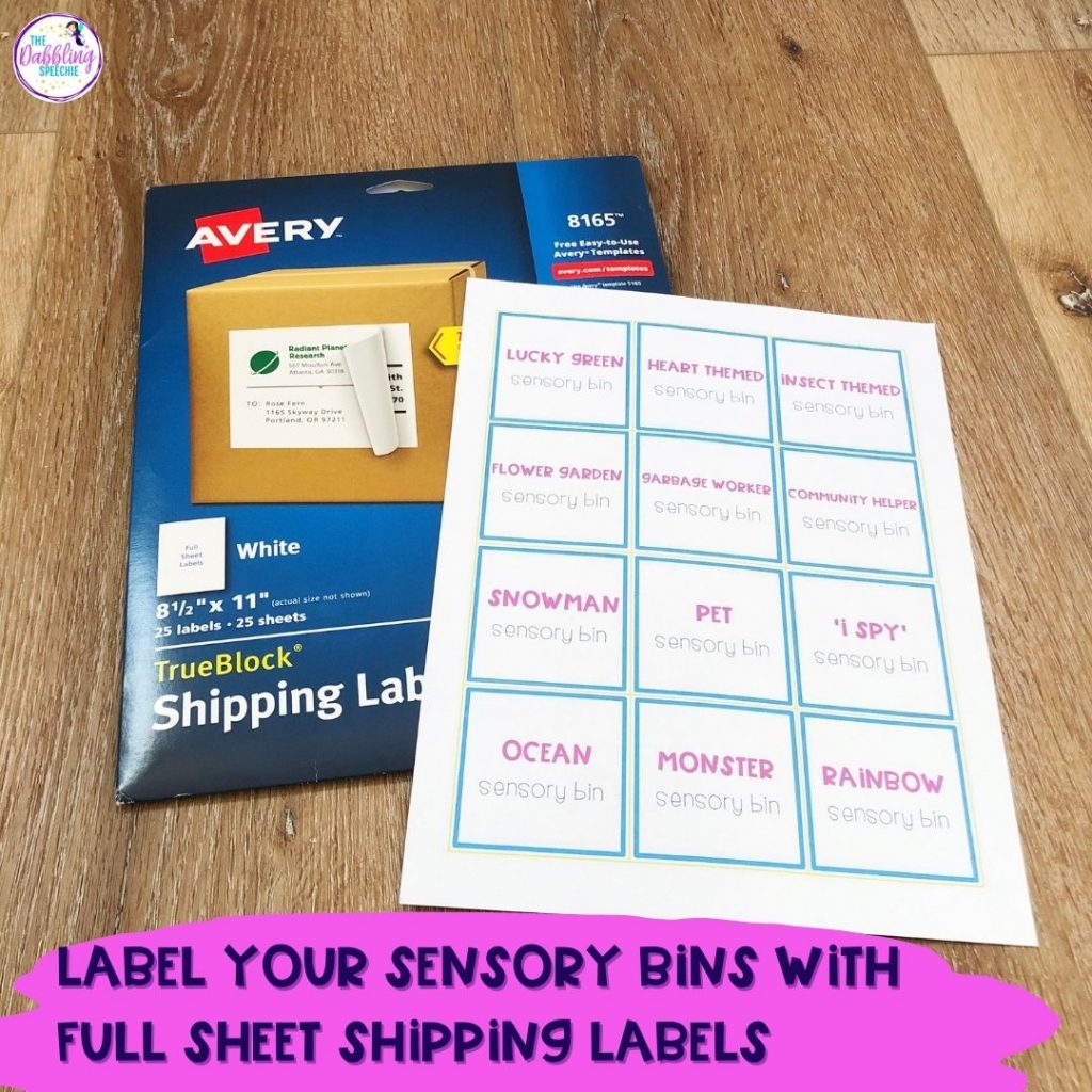 Having a label on the zipper pouch is super helpful when you want to identify sensory bin sets in your larger bins. You can create labels for your different containers and print them out on a full-page Avery shipping label. Cut them out and stick them on the zipper pouch.