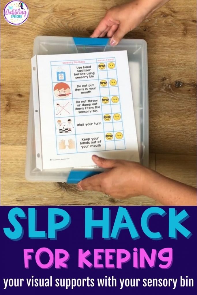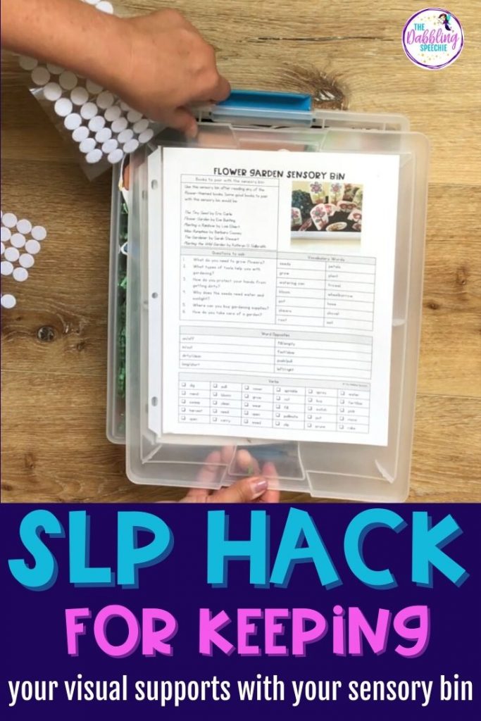 Have you ever had visual supports and cheat sheets that you like to access for your sensory bins in your speech therapy sessions? But, you aren’t sure where to store them so you can access them easily? You are lucky because I have the ultimate SLP hack for sensory bin material storage to share with you today!