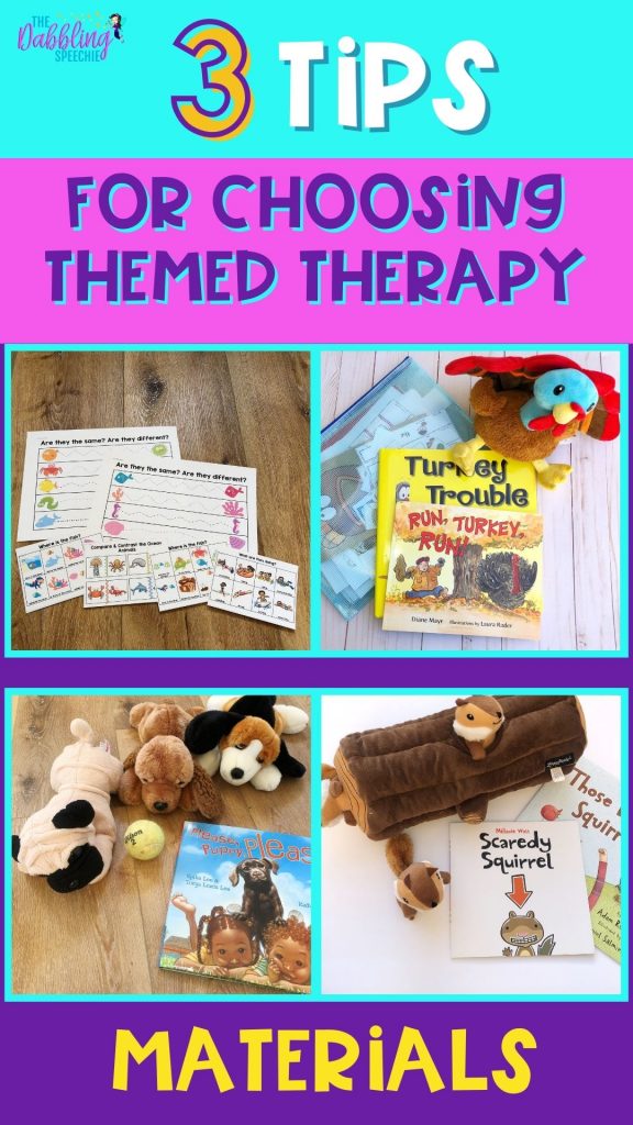 Selecting versatile materials that are easy to adapt across ages and goals is a key tip for a themed therapy approach. Ask yourself can the themed materials be used with any books related to the theme? Could you use them with early and upper elementary students? When you can adapt the material to cover a lot of goals, it means less time planning lesson activities. Check out this camping blog post for examples of how you can use this theme to cover a variety of ages and goals.