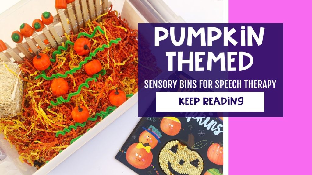 It’s officially the fall season, so it’s time to break out your pumpkin-sensory bins! One of the best ways to plan for your play-based speech therapy sessions is by making sensory bins that you can adapt and use to cover many goals. You can follow your student’s lead using these bins, and it won’t be stressful because you can download my FREE pumpkin-themed speech therapy cheat sheet for your bins (scroll down for the pink button.) Hopefully, these sensory bin ideas will help you plan for your pumpkin speech therapy activities unit.