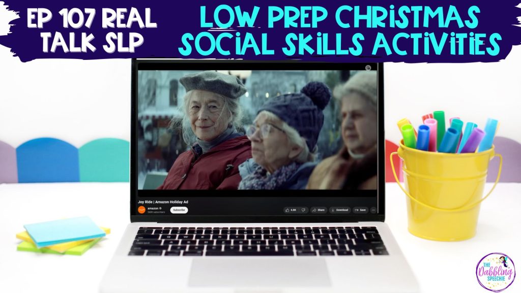In this episode of the Real Talk SLP podcast I am sharing easy, low prep Christmas social skills activities to help you rock your pragmatic language groups without stressing. Between the IEP meetings, finishing assessment reports, progress monitoring and running groups, you have zero time for planning. That’s why this round-up of Christmas social skills lessons will help you get to winter break with a smile! Planning Christmas speech therapy activities is easier with low-prep materials.