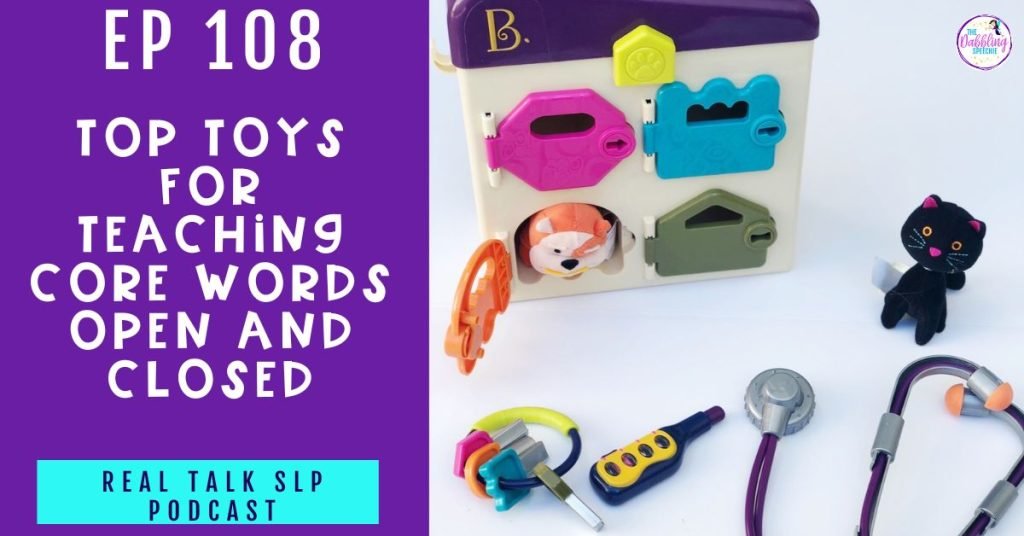 In this Real Talk SLP podcast episode 108, I share the top toys for teaching CORE words open and closed in your play-based speech therapy sessions. We want versatile toys when picking toys for our preschool and elementary caseload! That’s why the toys I recommend can work on AAC CORE words for open and closed and other speech and language skills