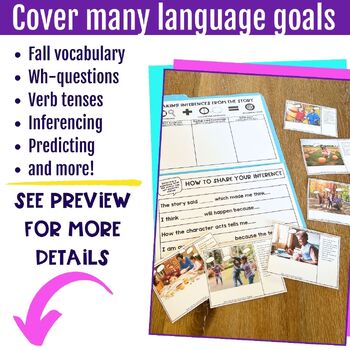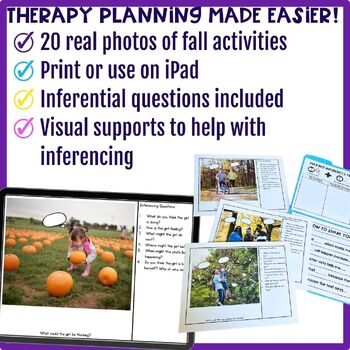 Need more inference picture task cards for your fall-themed unit? Have fall inference pictures that can be printed or used digitally for engaging speech and language therapy without the prepping stress! Use the real photos to target fall vocabulary, sentence formation, verb actions, perspective taking, predicting, and social pragmatic goals.