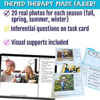 These inferencing with pictures speech therapy task cards help students practice making inferences, perspective taking, and answering inferential wh-questions using engaging real-life photos across all four seasons. This low-prep bundle includes seasonal task cards designed for SLPs working on inferencing speech therapy goals all year long for spring, summer, fall, and winter!