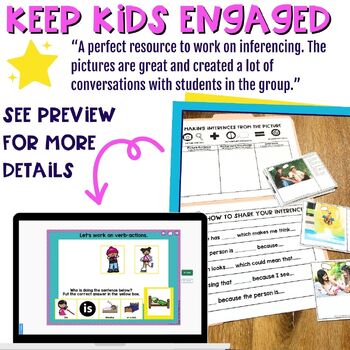 This inferencing with pictures bundle supports inferencing speech therapy goals aligned with reading comprehension and social communication standards for upper elementary students.