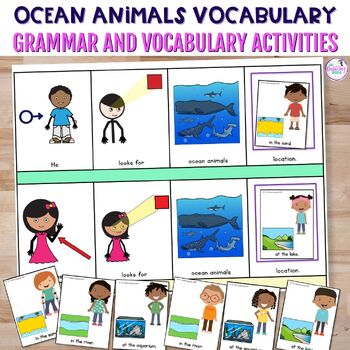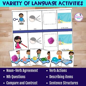 ❤️ Sea animal naming & sorting visuals by category or attribute ❤️ 2 sequencing sets: Dolphin Jumping and Hermit Crab Story ❤️ Sentence starters with open-ended response pages: I see ___, What did they find? ❤️ Noun marker + third-person singular grammar visuals ❤️ Location visuals for places like beach, tide pool, aquarium, and ocean ❤️ Bonus: Free sentence frame graphic organizer for extra practice
