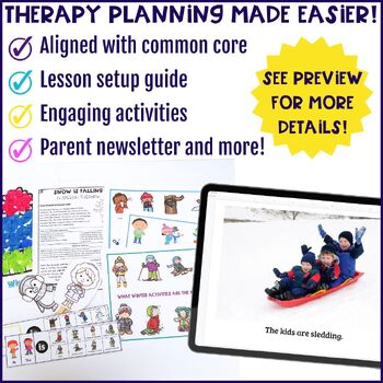 The language activities in this bundle include tips and tricks for push-in speech therapy. There is also a cheat sheet guide with recommended books (links include YouTube videos or amazon) for each themed lesson. The cheat sheet lesson plan guide links to the common core standards the activities are targeting. Each push-in lesson activity set includes links to themed movement videos and 3-5 extension activities to do at small group workstations. Included in all of the push-in lessons are Google Slides™ Speech Therapy Activities to use on a Smartboard, laptop, or iPad. The Google Slide presentation includes language extension activities to work on wh-questions, vocabulary, and grammar concepts.
