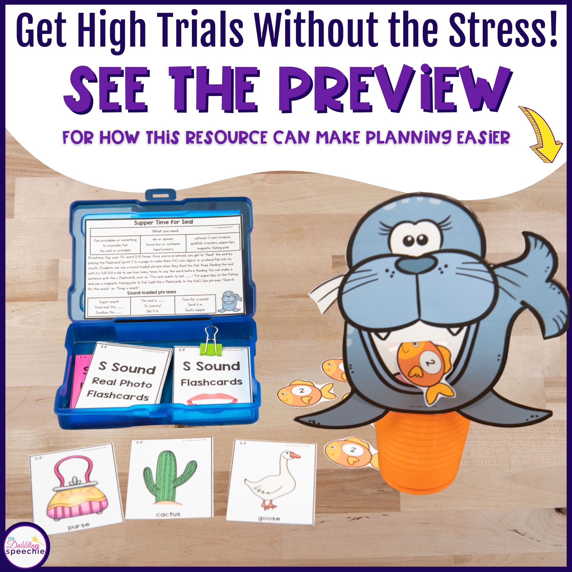 Perfect for individual sessions, small groups, centers, or home carryover, this no-prep S articulation flashcard activity set encourages 50–100+ trials per session.