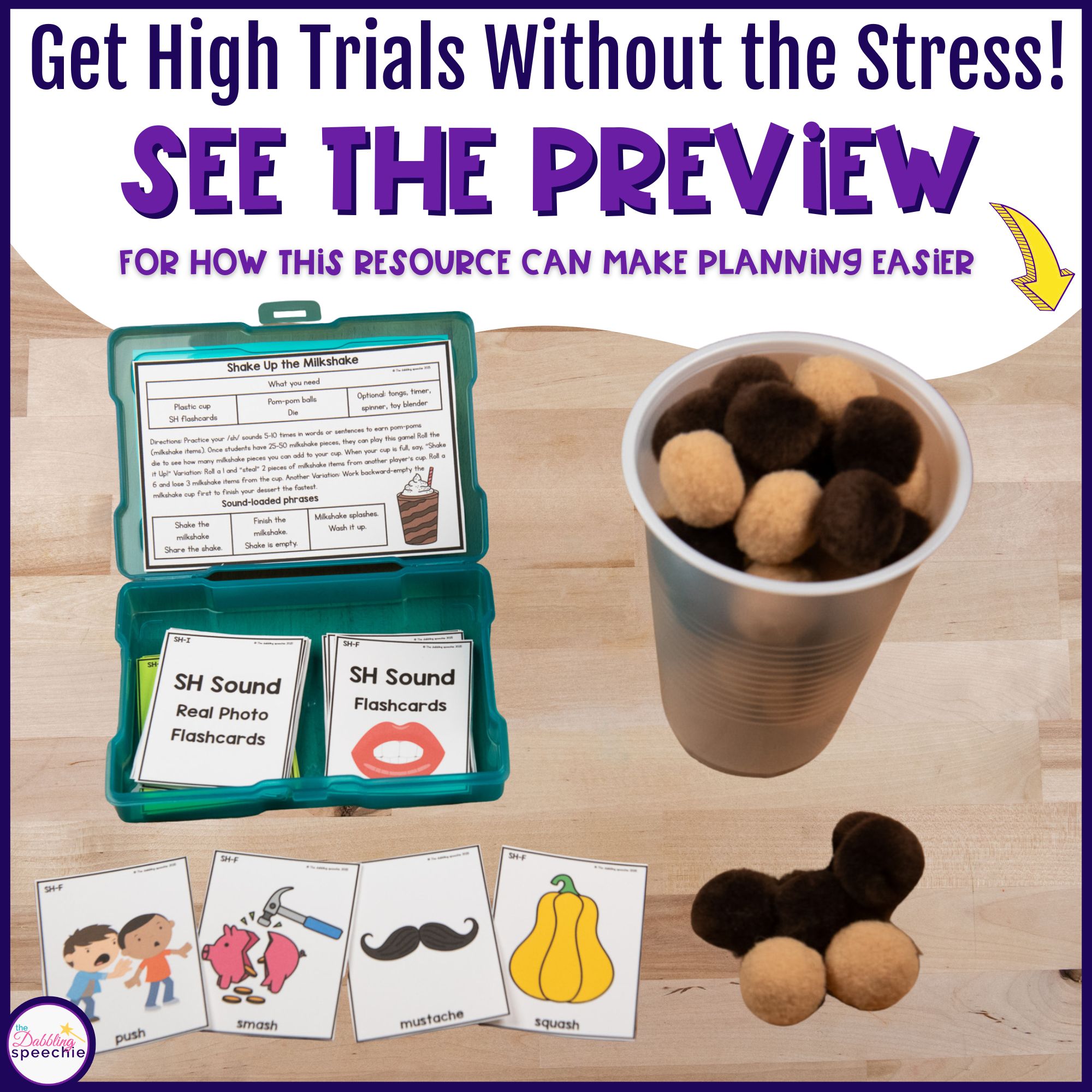 Perfect for individual sessions, small groups, centers, or home carryover, this no-prep SH articulation flashcard activity set encourages 50–100+ trials per session.